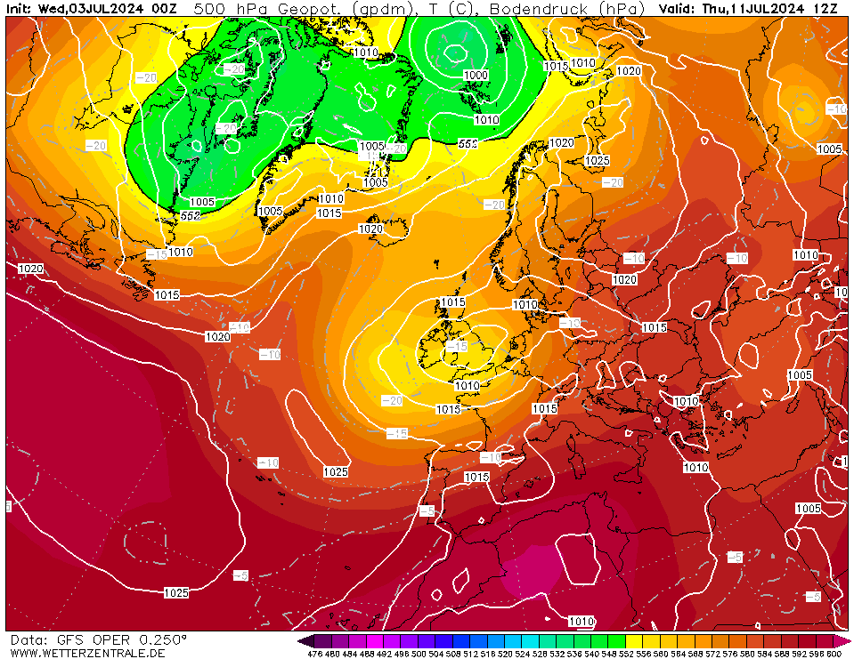 Momenteel hebben we met een klassieke ‘slecht zomerweer’ setting van doen. Met hogedruk rondom Groenland en lagedruk op de Noordzee. Die depressies worden gedwongen om routes te nemen over de Lage Landen. Want vanaf Zuid Europa is er juist hogedruk. De lagedrukgebieden die onze lente (en deel van de zomer) hebben gesmoord zitten als het ware vast tussen deze twee hogedrukgebieden. Zou de luchtdruk rondom Groenland gaan dalen, dan zouden de depressies een veel noordelijkere route kunnen nemen en komt er boven Noordwest Europa eindelijk een mogelijkheid tot duurzame hogedruk. Als die status quo ongewijzigd blijft heeft de zomerliefhebber vooral veel geluk nodig. Dit geluk kan zich uiten in lagedrukgebieden die tijdelijk even uitgeblust raken waardoor stabilisatie kan optreden rondom de Britse eilanden en de Noordzee. Dit laatste is voor de komende periode het meest waarschijnlijk. Maar wie scherp leest komt al snel tot een confronterende conclusie.
