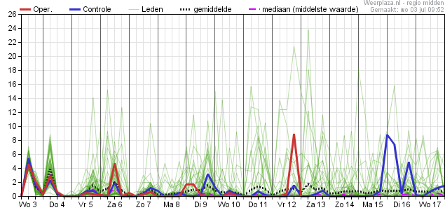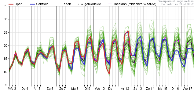 In mijn optiek heeft deze zomer moeite met ‘normaal’ te doen. Beetje het hollen of stilstaan idee. Het scenario zoals de pluim nu schetst met dagenlang 22 graden en zo nu en dan zon lijkt mij niet het meest voor de hand liggend. Als u het mij vraagt zou ik zeggen dat de uitvoer de komende tijd nog flink kan gaan schuiven. In het donkere scenario nemen uitdiepende lagen vanaf de lagere breedtegraden (typisch verschijnsel dit jaar) de boel weer razendsnel over en blazen eventuele pogingen tot een stabiel en zonnig weertype heel snel op zoals we dat vaker hebben gezien. Dat zullen we terugzien in de pluim in de vorm van steeds natter en steeds koeler per run. In het zonnigere scenario krijgt hogedruk eindelijk vaste voet aan grond boven onze hoofden en kunnen lagedrukgebieden een halt worden toegeroepen. Denk bijvoorbeeld aan een scenario van een stationair ‘trekpaardlaag’ boven de Golf van Biskaje (of in iets ten zuidwesten van Ierland) dat ons binnen luttele dagen in de warmte kan onderdompelen. Of de totstandkoming van een verbinding tussen hogedrukgebieden en als gevolg daarvan een langdurige blokkade. Mijn gok zou toch zijn het scenario van de oceaan als uiteindelijke overwinnaar. Ik ben momenteel niet zeer optimistisch en verwacht dat er de komende runs nattere en koelere scenario’s insluipen. Maar voor hetzelfde geld gebeurt het tegenovergestelde, dat is nu juist de moeilijkheid. Zelfs langere tijd normaal zomerweer behoort ook tot de mogelijkheden, want in het verleden behaalde resultaten bieden nog altijd geen garantie voor de toekomst. Wie het weet mag het zeggen!