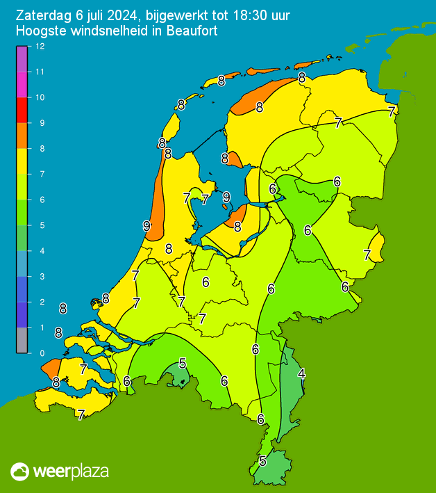 Een windstoot om 17:30 van 75 km/h. En een kortstondige windkracht 7.