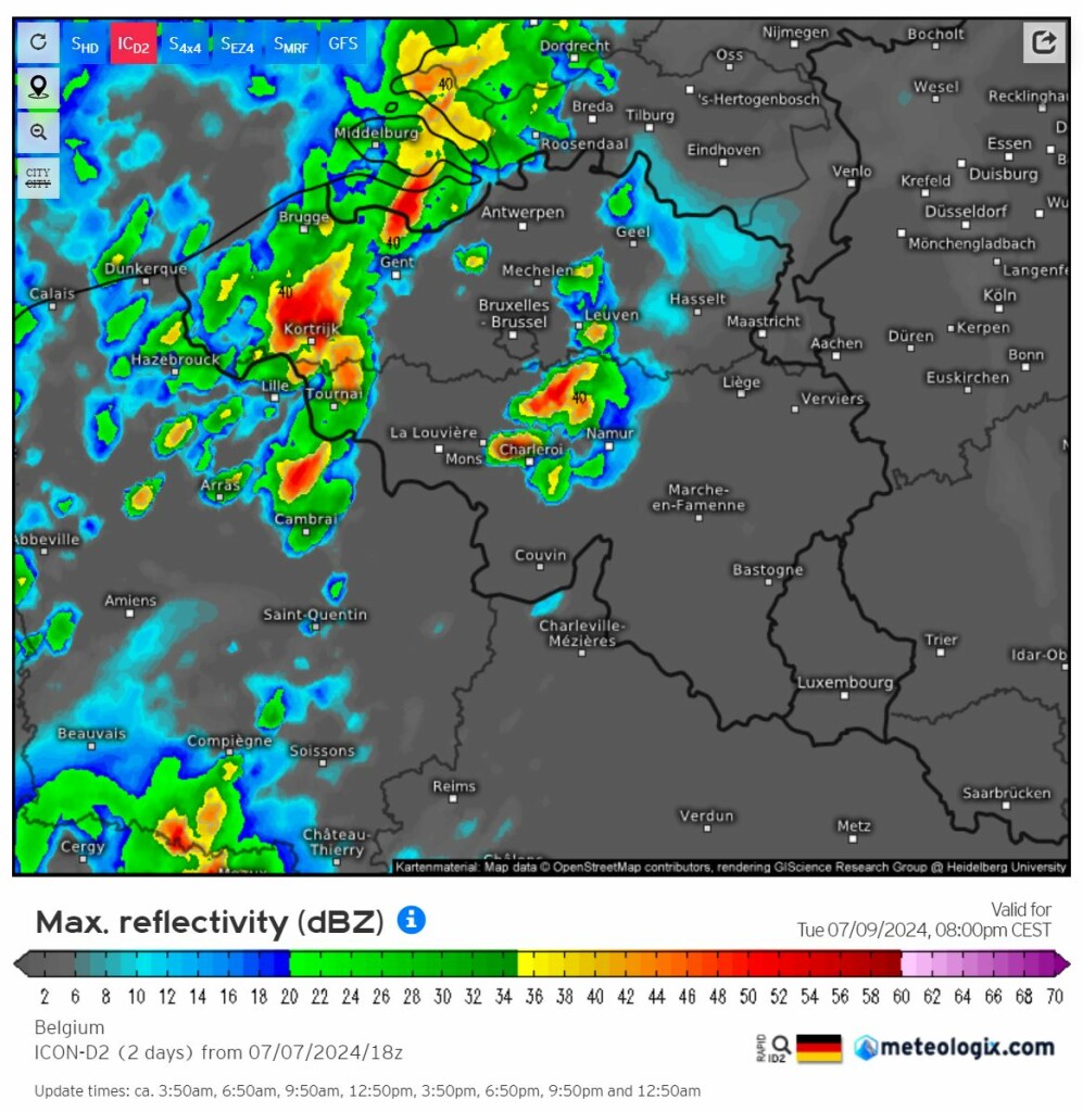 Met behoorlijk wat regen en onweer op het front zelf (westelijke helft van de Benelux) en vrije convectie in de voorhoede, wat dan eerder voor centraal tot oost BE is. Later waarschijnlijk ook voor NL. De afbeelding geeft het laatste frame van deze run aan, dus loopt ongetwijfeld nog verder. Het kan aardig opwarmen tot bijna 30 graden in het oosten. Champagne streek gaat zelfs tot 33 graden.