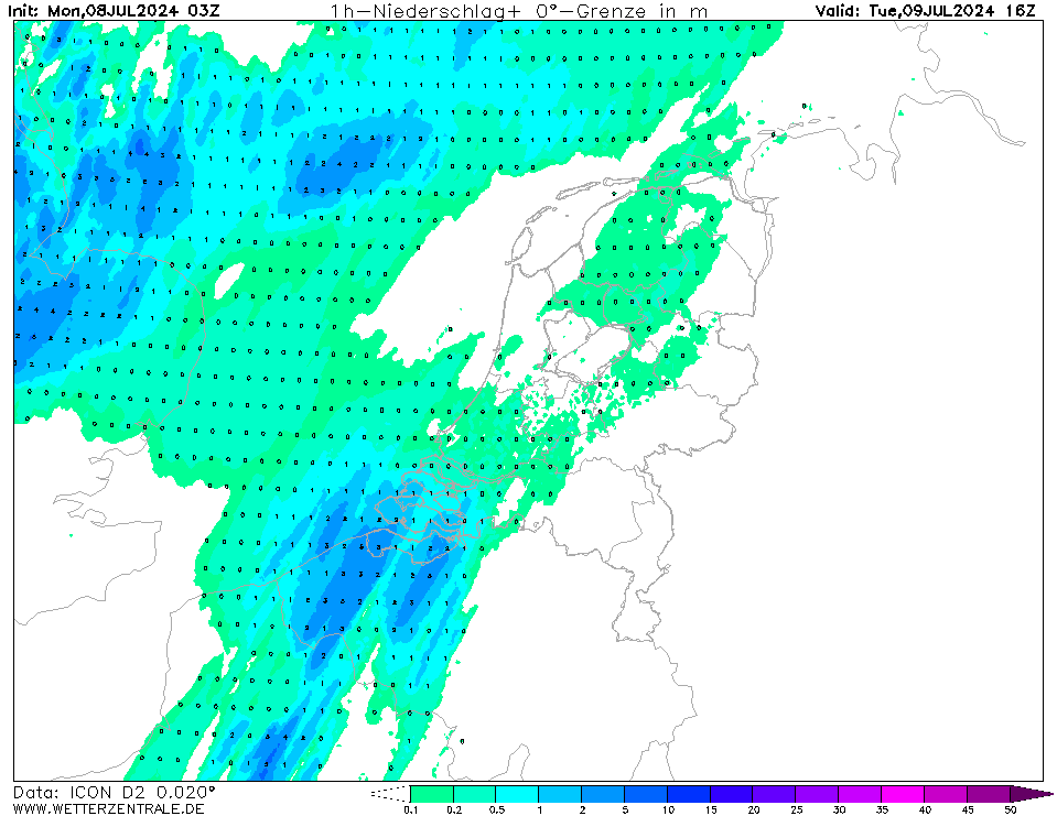 ICON 03z laat eerste buien zien aan het einde van de middag boven België en Zeeland: