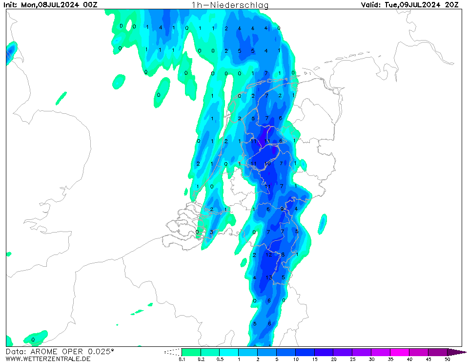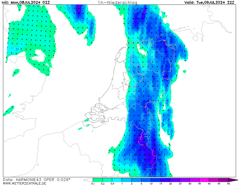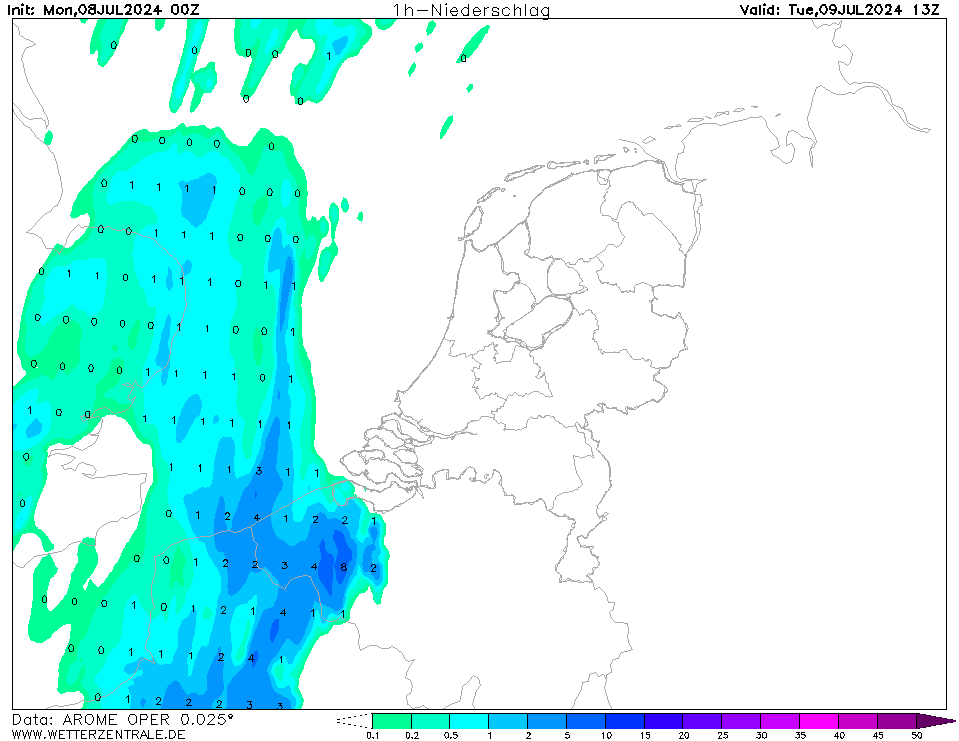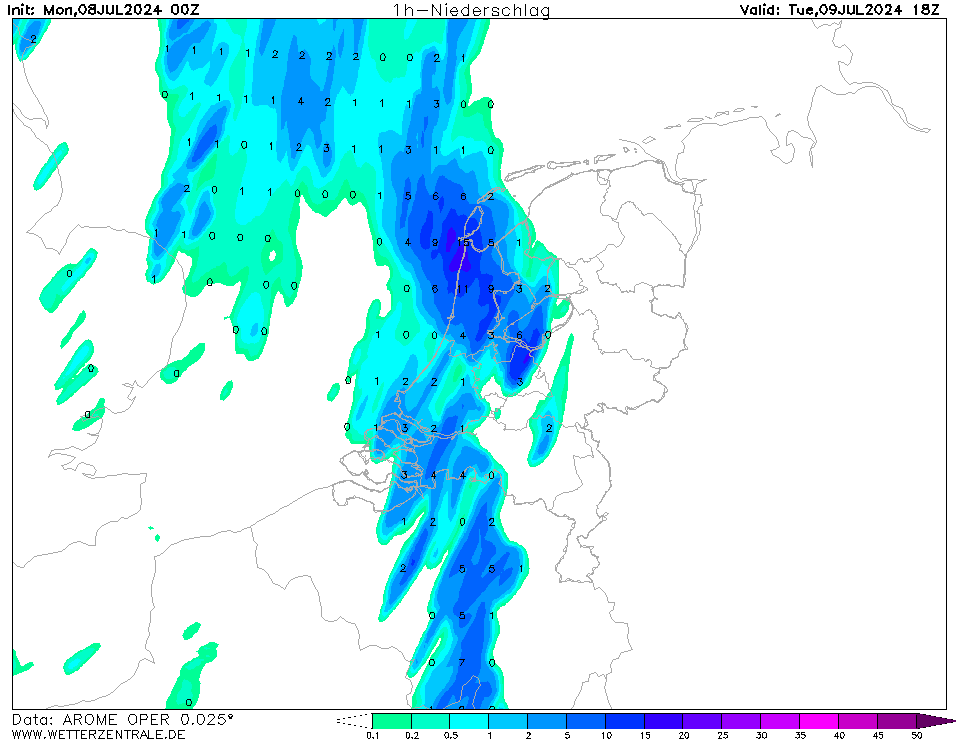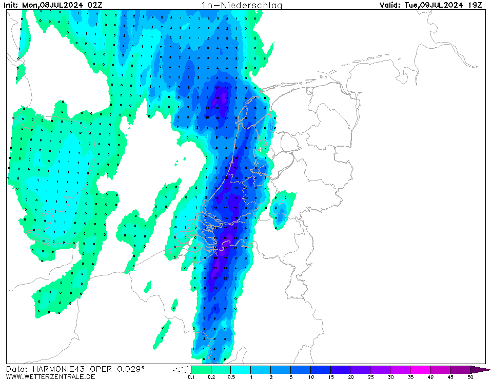 Duidelijk te zien waar de meeste neerslag lijkt te gaan vallen: