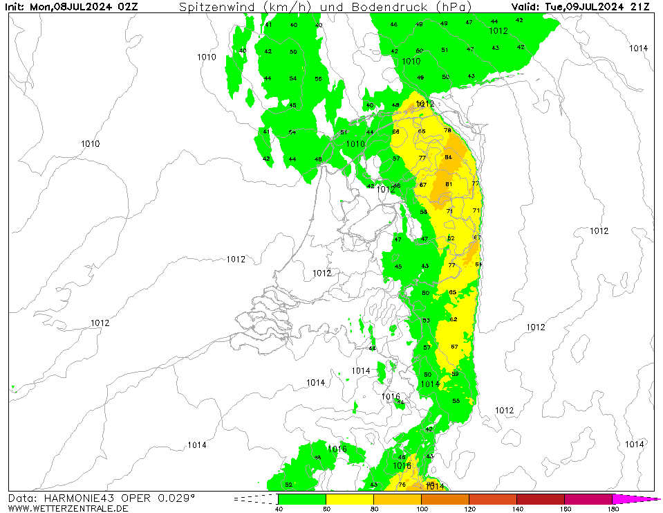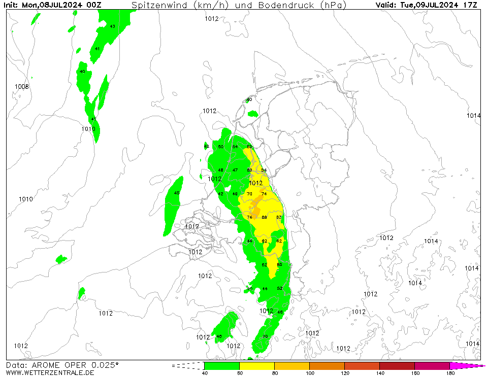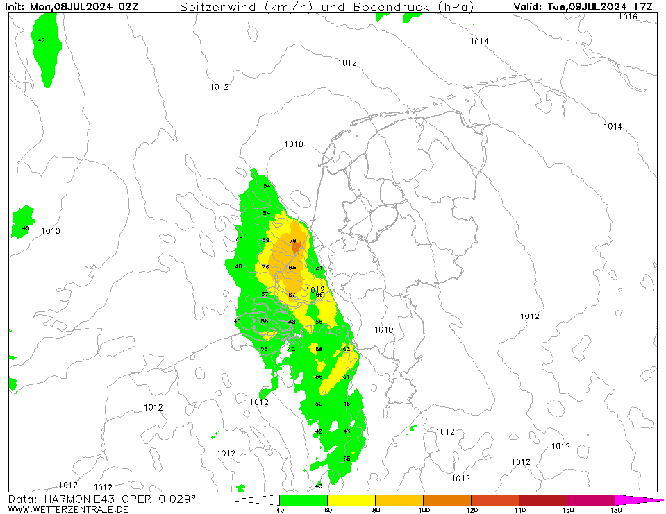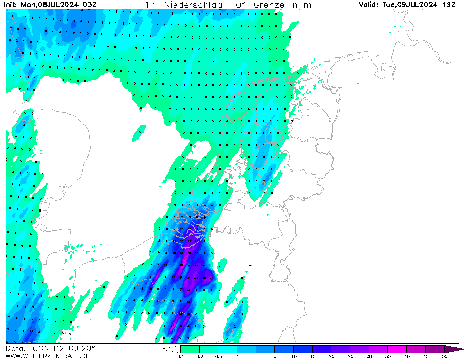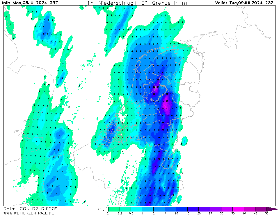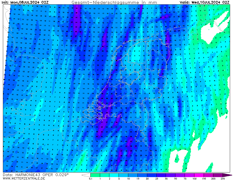 Duidelijk te zien waar de meeste neerslag lijkt te gaan vallen: