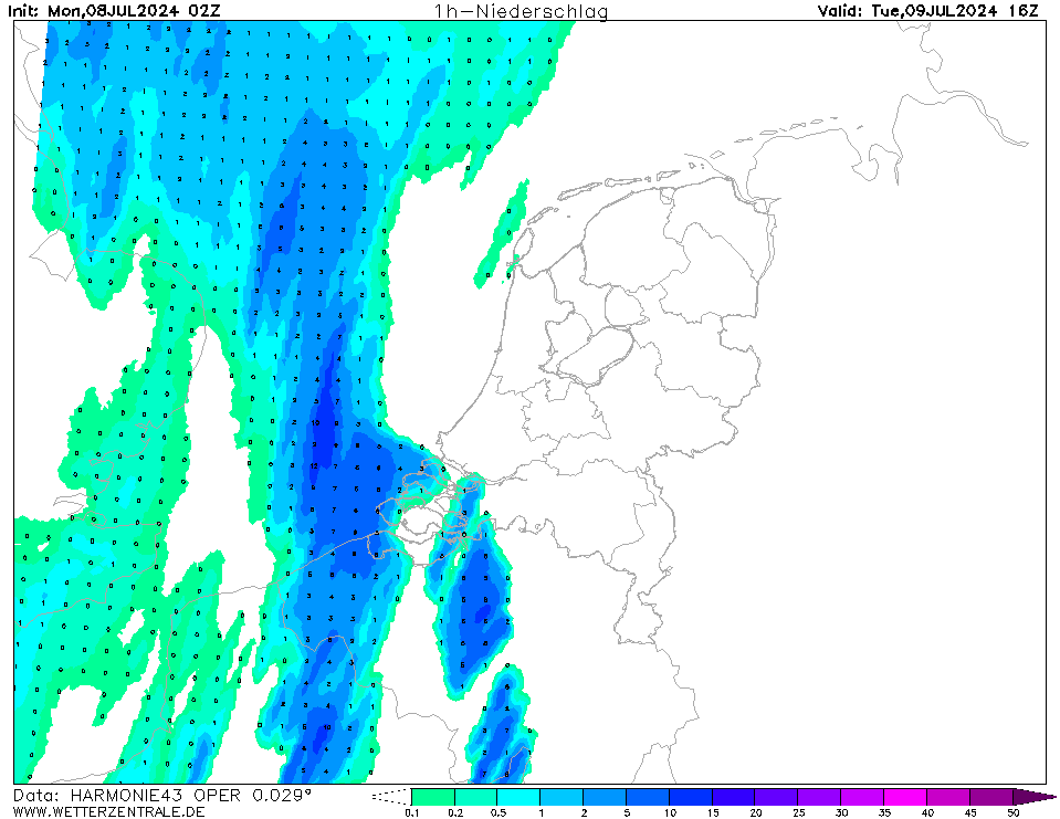 HARMONIE (KNMI-NL) 02z laat de eerste buien ontstaan boven België: