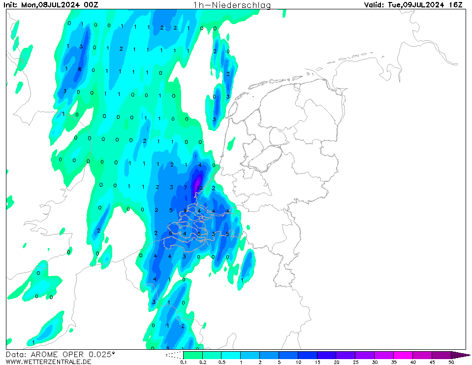 AROME 00z laat halverwege de middag al buien toe boven België: