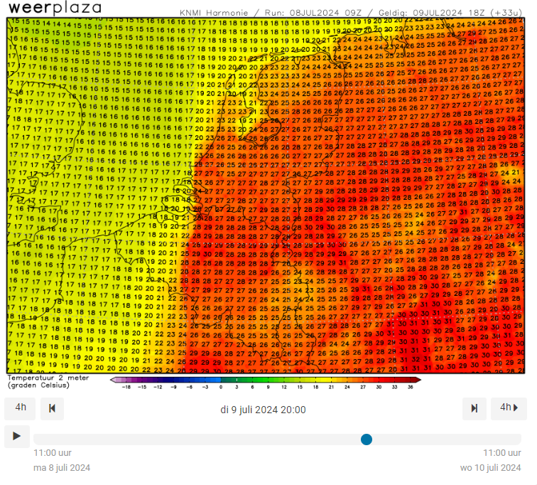 Overdag op grote schaal 29-30°C in het binnenland, lokaal 31.