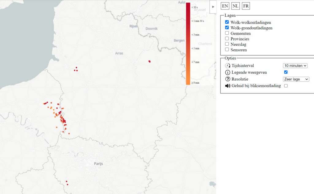 Ik schreef eerst: geen, maar net wel eentje. Maar de voorbije periode dus niet. Noch het netwerk van het KMI (waar ik zowel CC als CG aan heb staan en er van beide dus niks geregistreerd wordt), noch bij blitzortung. De andere ook maar bitter weinig.