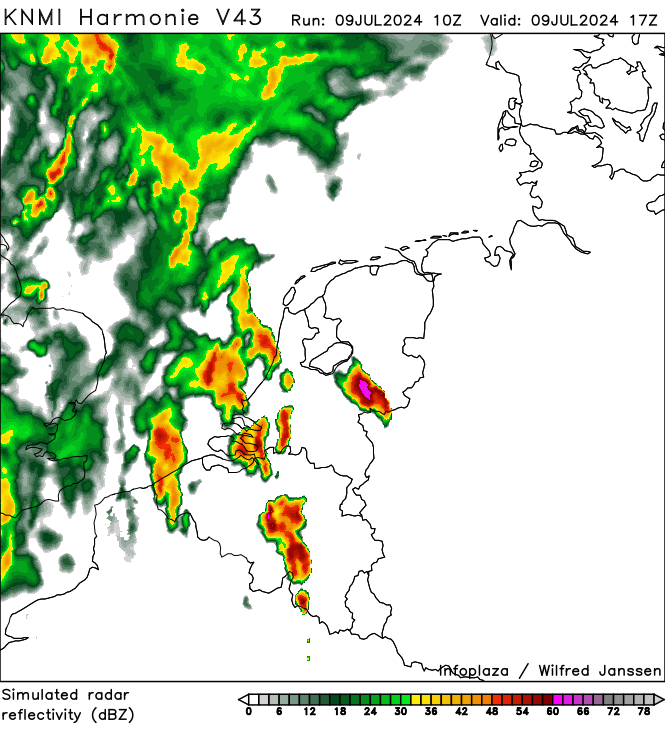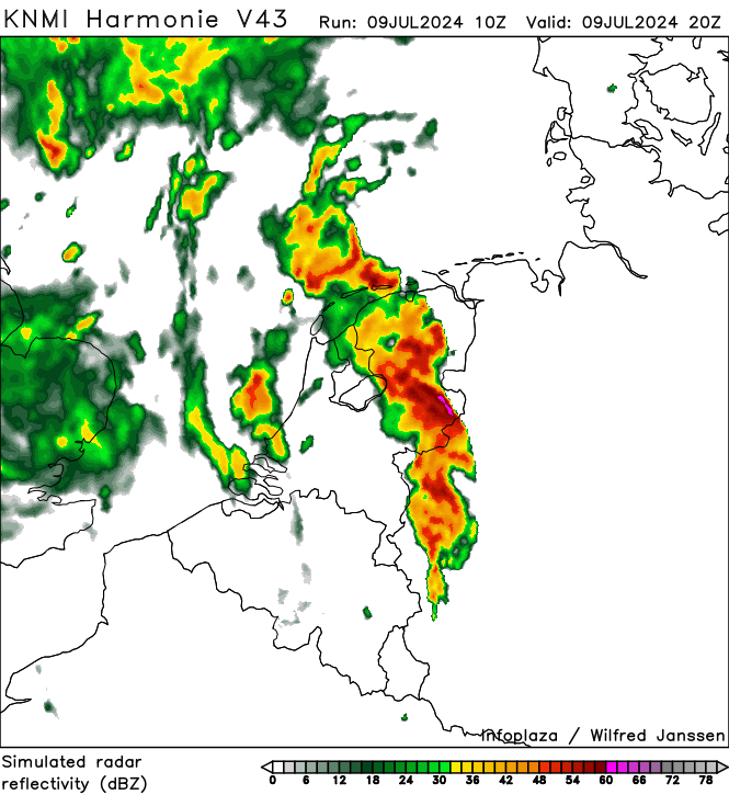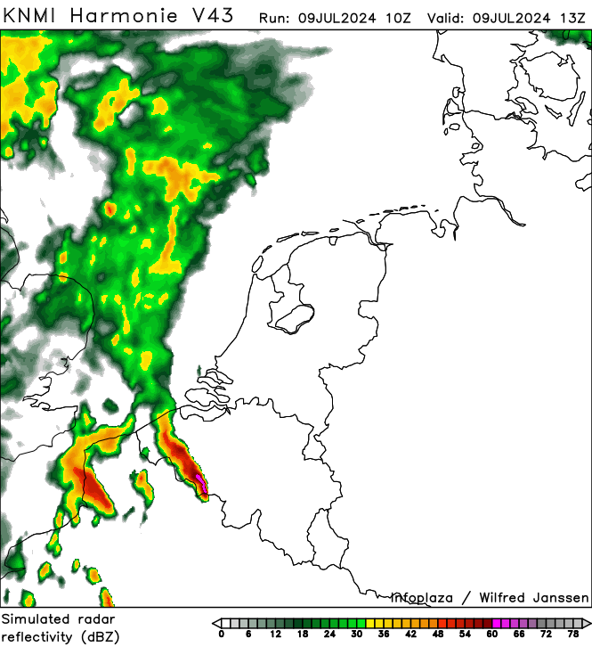 Bovenste kaartje de berekende situatie voor 15:00. Volgens harmonie houdt deze cel het lang vol en komt hij recht op Arnhem af. Dat zal dan wel niet uitkomen.