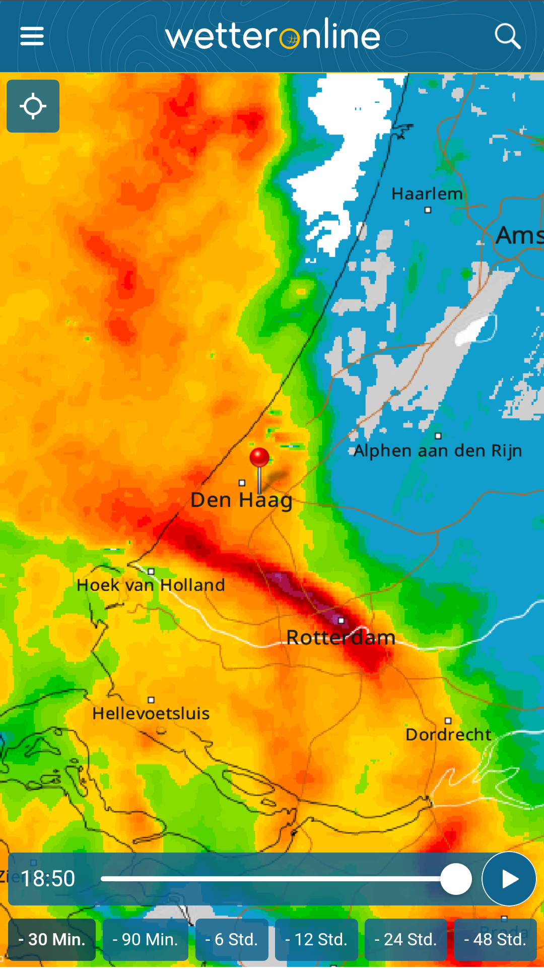 Paar flitsen, paar verre donders te horen. Max. Rainrate 46 mm/u, totaal 9 mm uit het lijntje. Windstoten ca. 35 km/u. De bulk van dit lijntje lijkt voor Rotterdam te zijn