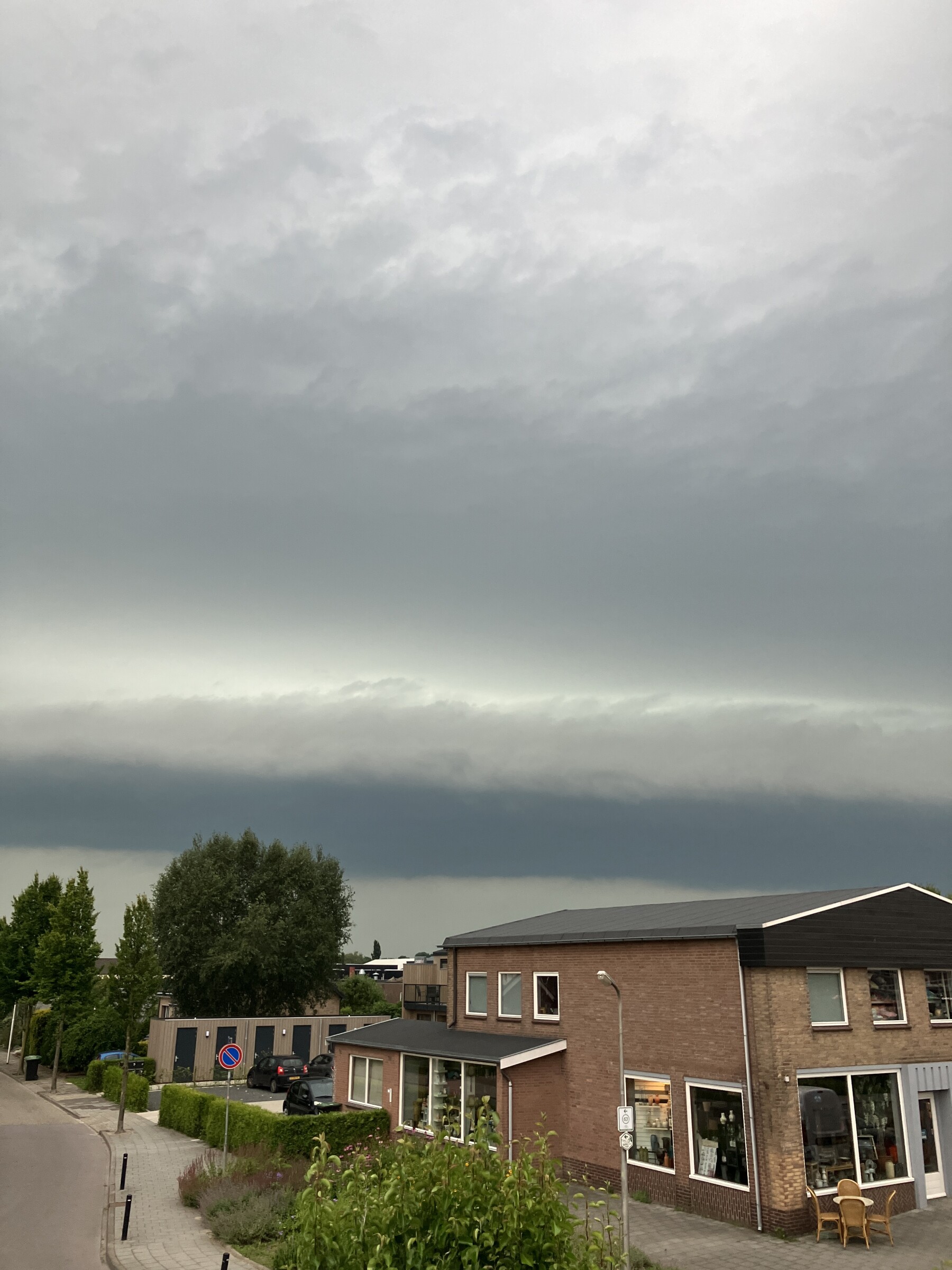 Trekt hier aan 2 kanten langs. Gerommel op afstand, wat licht geflits en lichte regen. Passage front even flinke wind toename ongeveer 3 minuten lang. De arcus trok razend snel over. Temperatuur razendsnel gezakt van 26 naar 21.