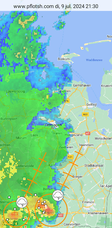 Heel gaaf! Die supercell (cel rechtsonder) ging rond 22.00u op in de squall en trekt hier nu over met bijzonder hoge rainrates van 130mm/u en hoger.
