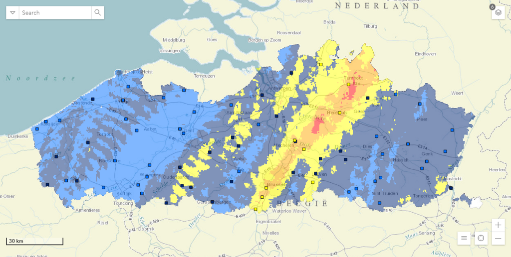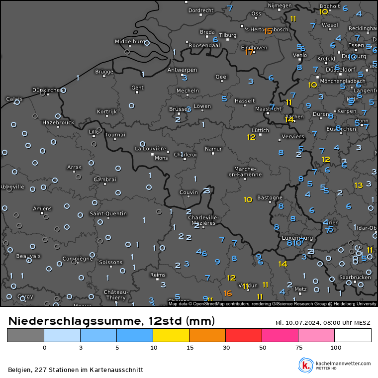 Aangezien waterinfo de neerslag over de voorbije 24 uur geeft, is het nog niet te laat om de neerslagtotalen over Vlaanderen vanaf gistermiddag weer te geven. In het oosten is er sinds gisteravond een paar mm bijgekomen, maar het gaat hier om de hoeveelheden in het spoor van de zwaarste cellen. Er zijn sommen tot boven de 75 mm!
