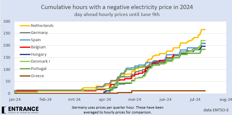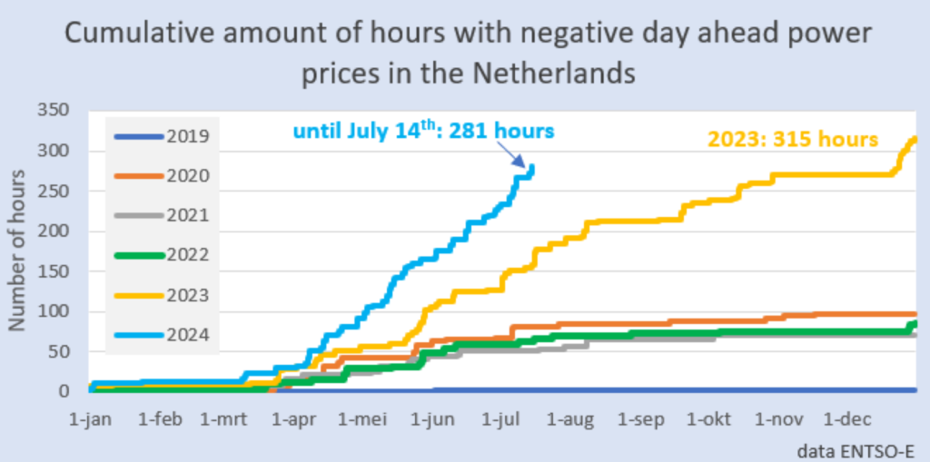 Het aantal uren met een negatieve stroomprijs blijft maar omhoog schieten, ondanks het feit dat er relatief weinig zon is deze zomer. Het totaal staat op 281 uur, dat is bijna 6% van de tijd.