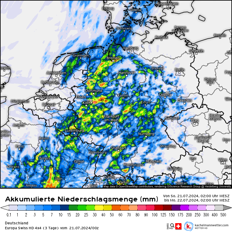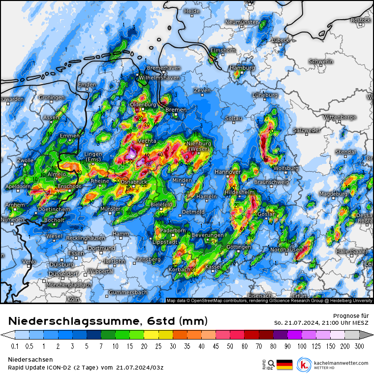 Meerdere modellen geven voor later vandaag een ontwikkeling van zware buien in het oosten van Nederland, maar nog forser in een aanzienlijk deel van Duitsland. Allicht voor een deel ook met onweer. ICON-D2 komt zelfs met een piek van 150 mm in noord Duitsland binnen 6 uur! Zie de tweede afbeelding; dat zal wel een uitschieter zijn.