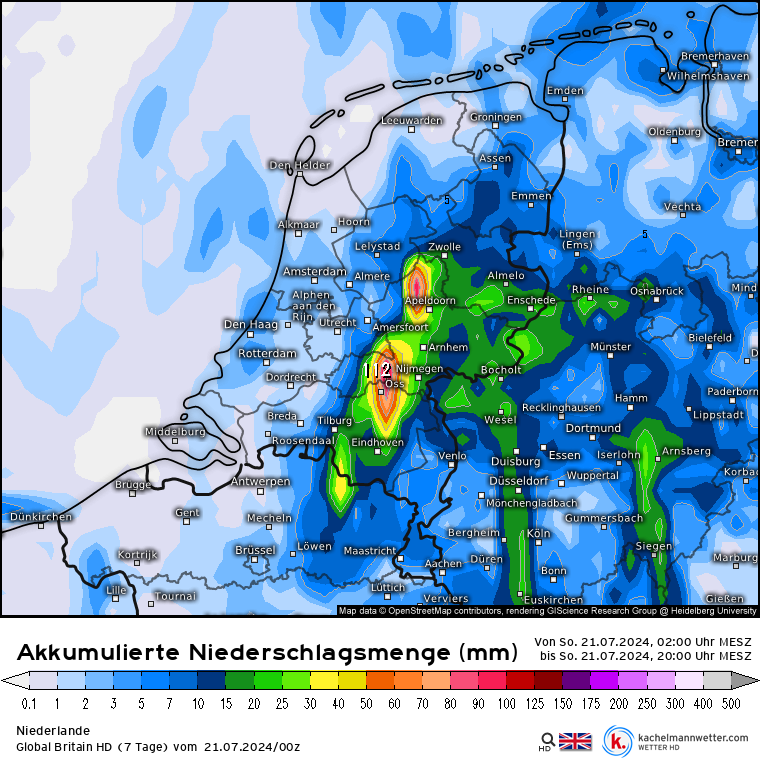 UKMO-HD komt met deze merkwaardige verdeling, met tot rond 100 mm in twee gebieden (zie ik daar Oss staan? ). Maar daarbij relatief weinig in Duitsland.