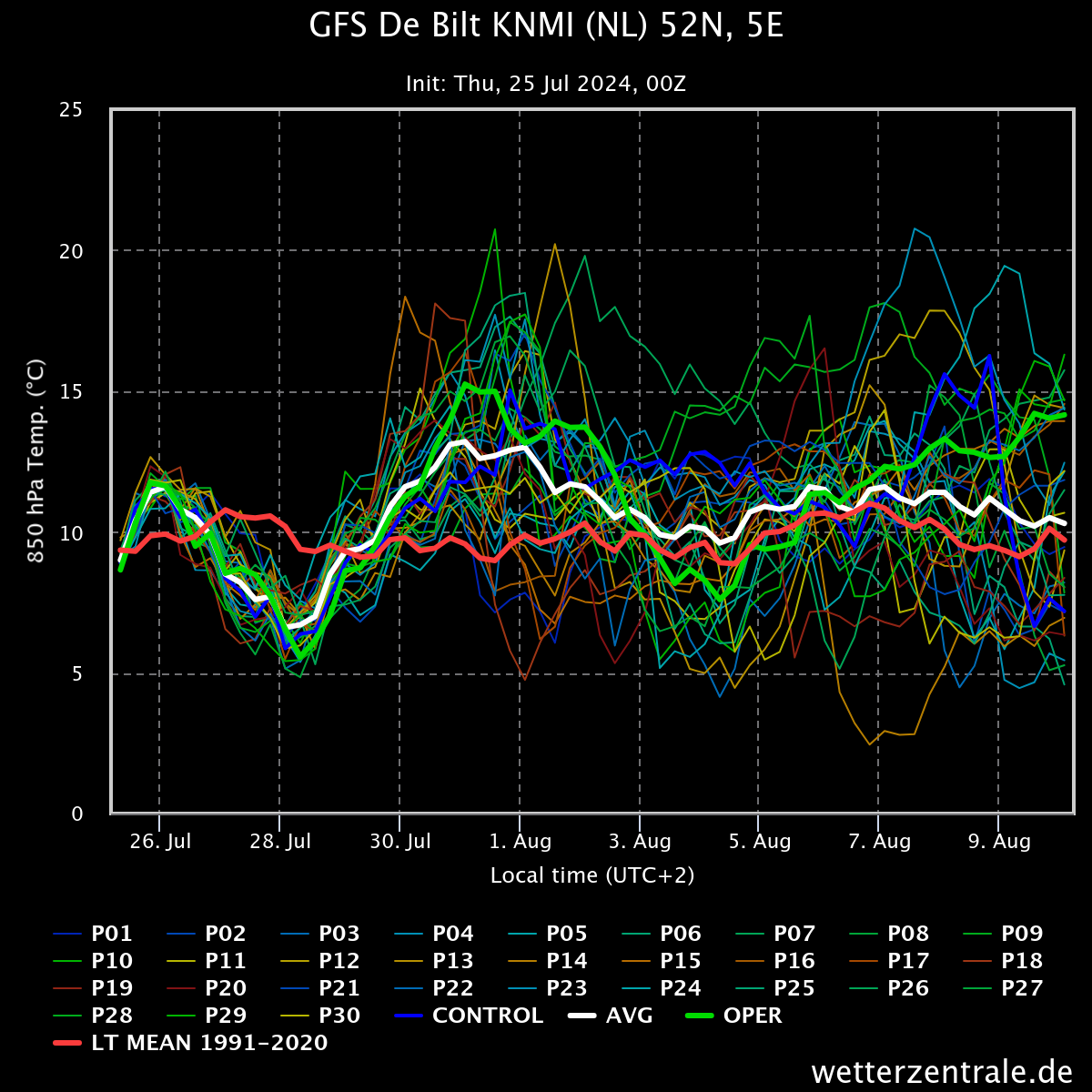 Zie hieronder de T850 pluim van GEFS00z. Ter illustratie van de setting is één van deze zeer warme leden ook bijgevoegd.