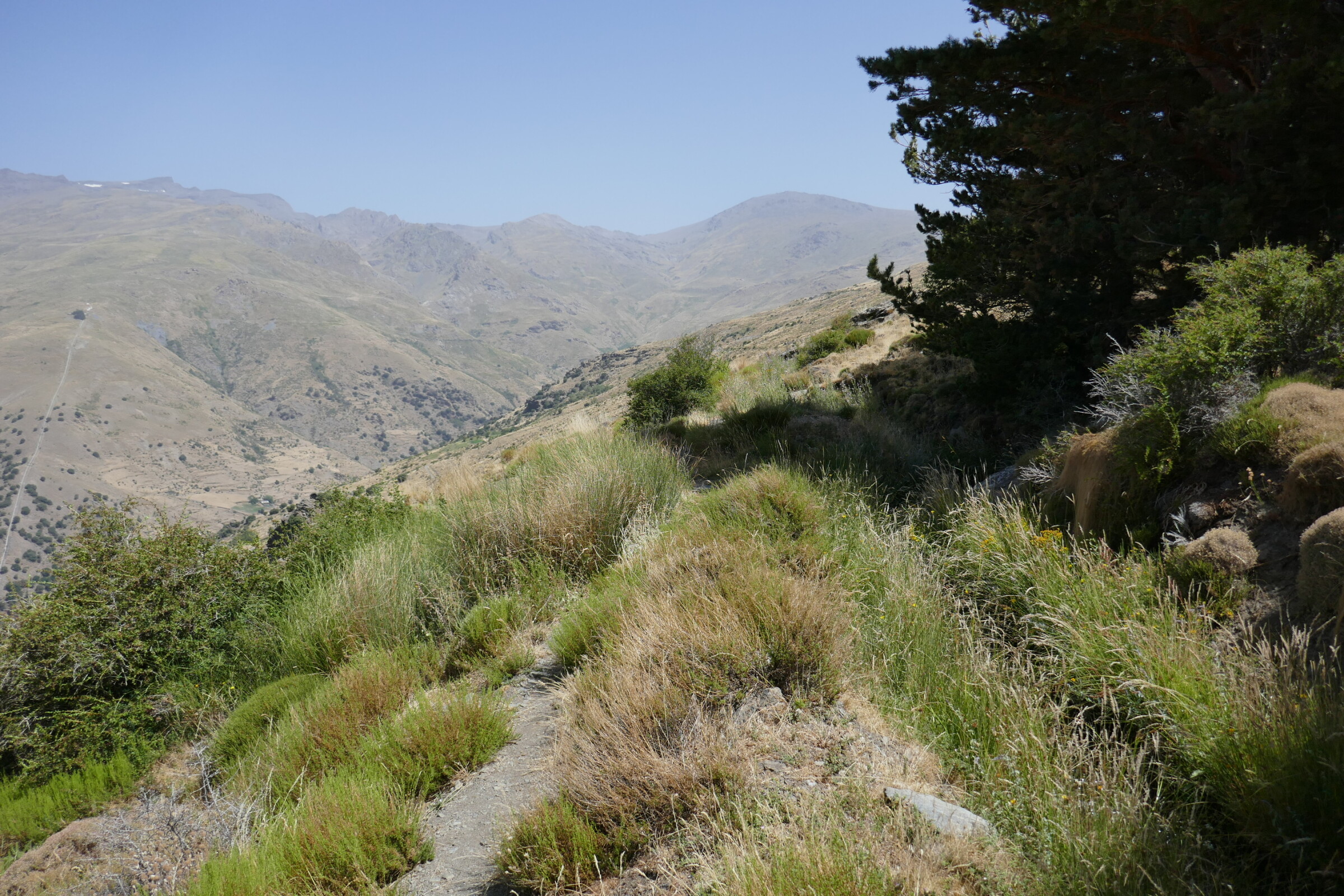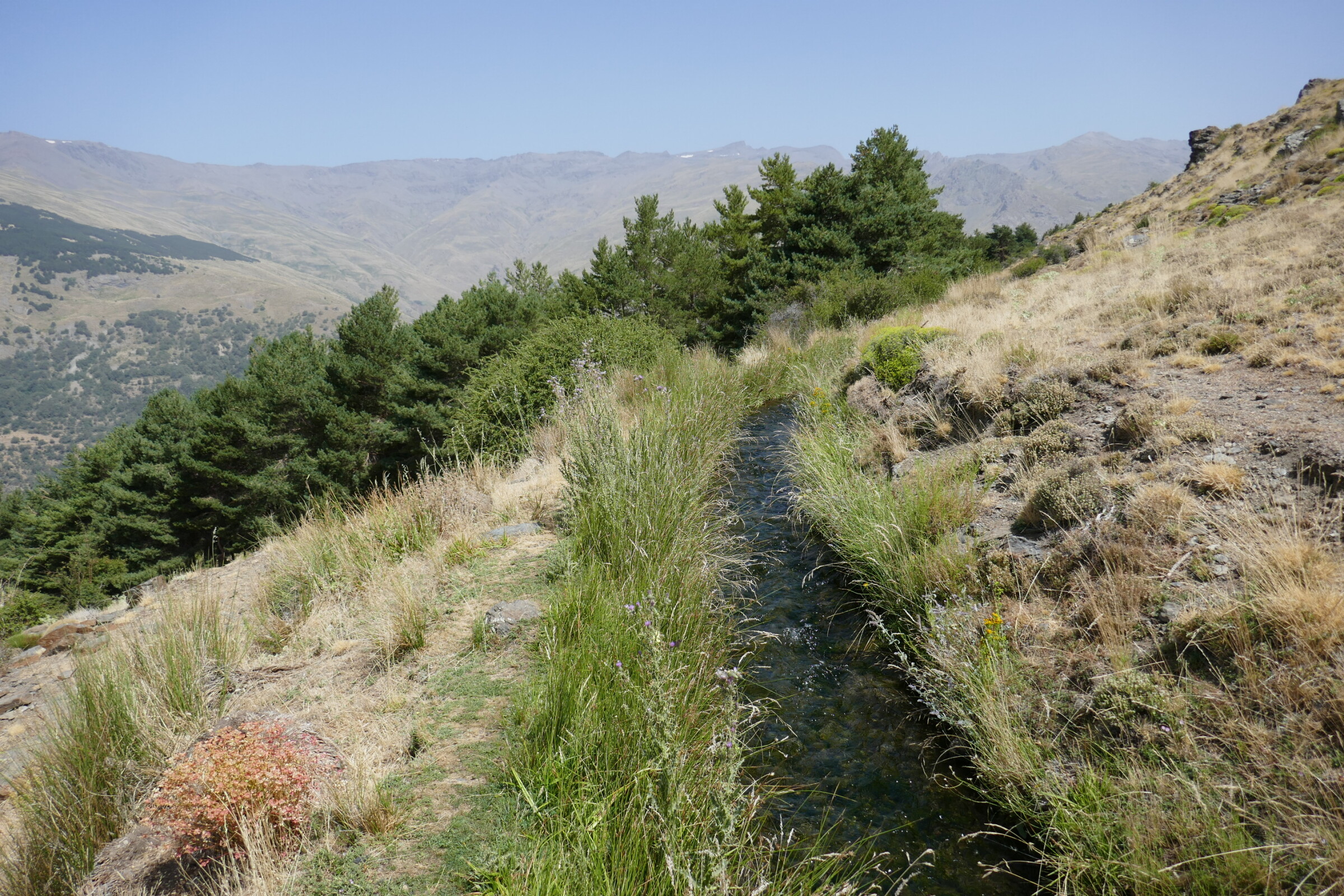 Met zicht op het hoogste punt van het Spaanse vasteland. Op de tweede foto een acequia, honderden jaren geleden aangelegd om (smelt)water richting dorpen te dirigeren. En er ligt zowaar nog een restje sneeuw op een zuidelijke flank.