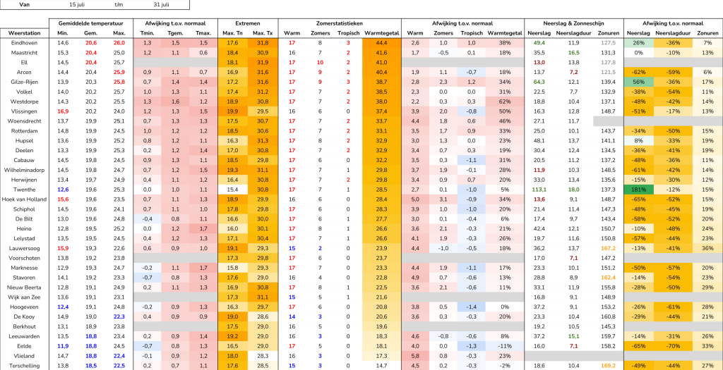 Voor de periode vanaf 15 juli ligt de gemiddelde temperatuur op alle KNMI-stations boven de norm, ook wat betreft de maximumtemperatuur. Ook is de afwijking in de zonneschijnduur op alle KNMI-stations positief, variërend van +6% in Arcen tot +36% in Lauwersoog. En alleen voor Twente, Gilze-Rijen, Eindhoven en Hupsel ligt de neerslagsom boven de norm.