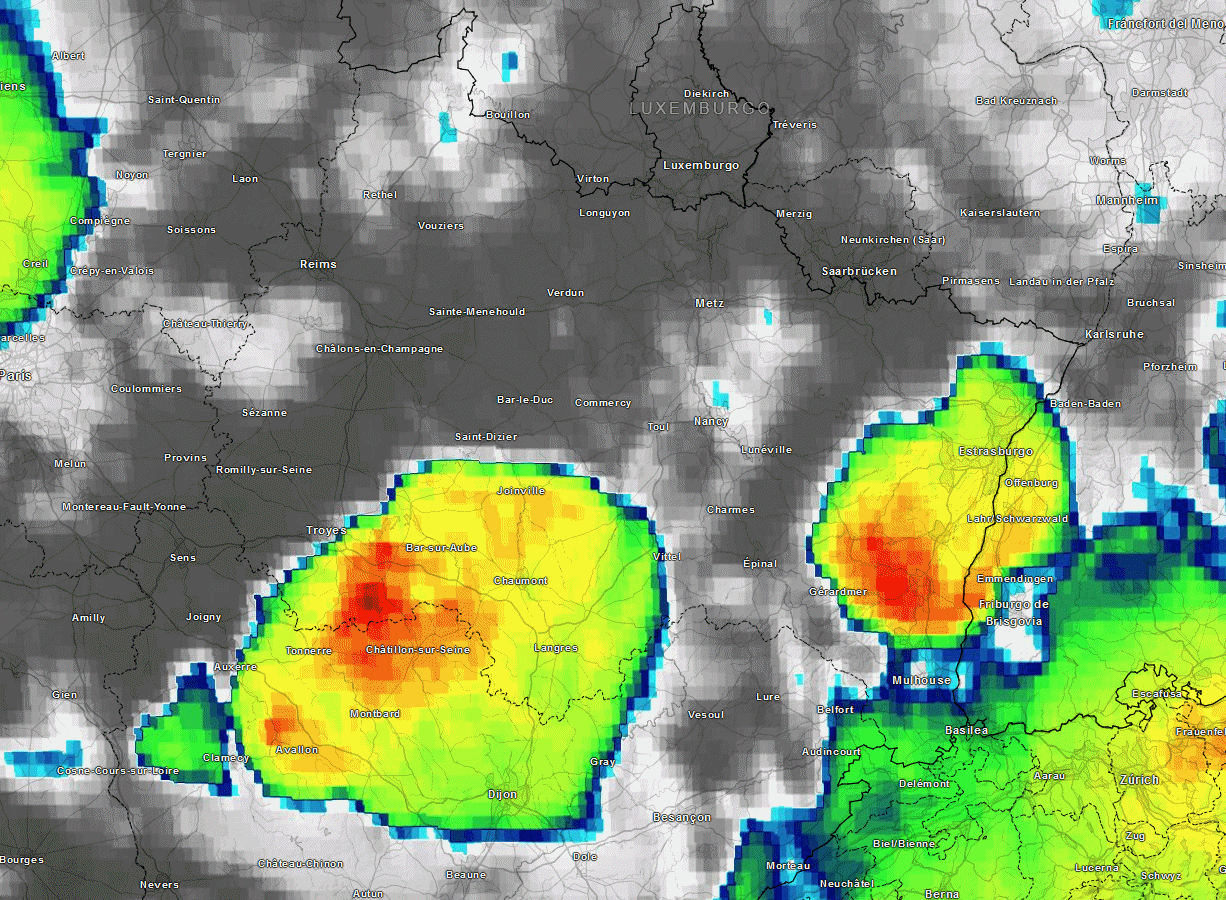 Op de website van Keraunos is nu een artikel verschenen over de zware onweersbuien met deels veel neerslag van gisteren. Hierin ook een loop van het 'Orage en V' aan de westrand van de Vogezen. Het is duidelijk te zien dat de cel een heel eind ten westen daarvan ook stagneerde, maar daar is volgens mij te weinig relief om dat ook een echt orage en V te noemen. Was dit een soort van stagnatie (filevorming zou je haast zeggen) achter de oostelijke cel? De hele loop is bijzonder om te zien.