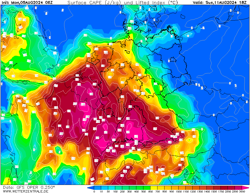 GFS oper komt met buien in de nacht van zondag op maandag en een waterbommetje op dinsdagavond. Aan CAPE en schering ontbreekt het niet. EC ligt dwars, maar GEM, AIFS en ICON zien het wel zitten. Hopelijk draait EC nog bij. De periode daarna lijken we wel de 'herfst' in te duiken.