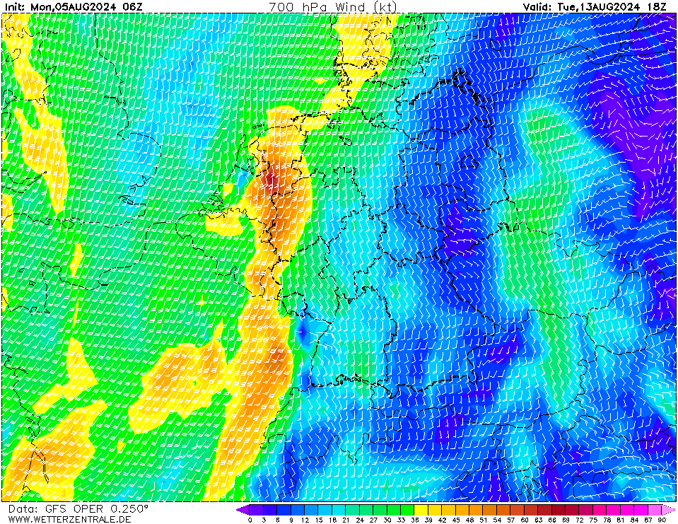 Neerslag + 700 hPa wind dinsdagavond: