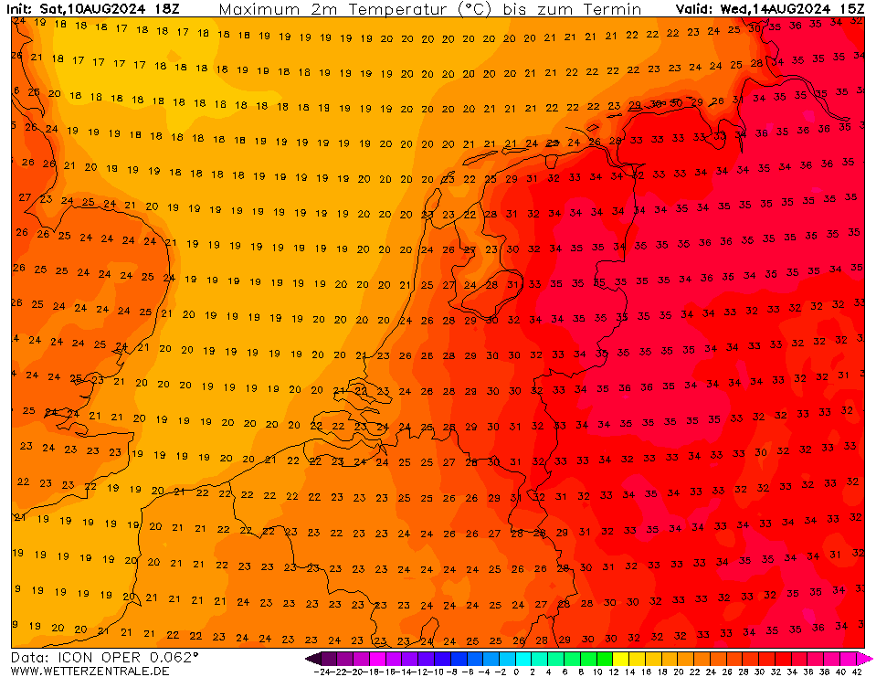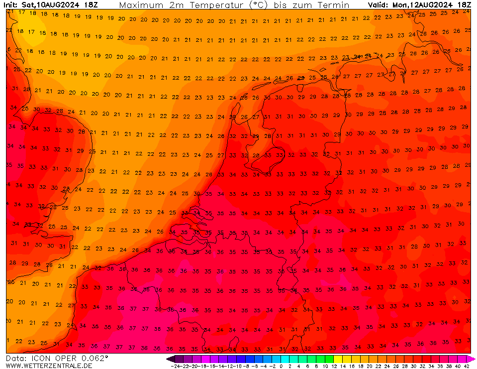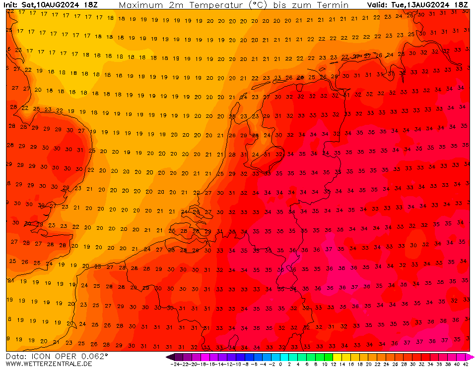 Dinsdag veelal 33-36 graden in de oostelijke helft van de Benelux.