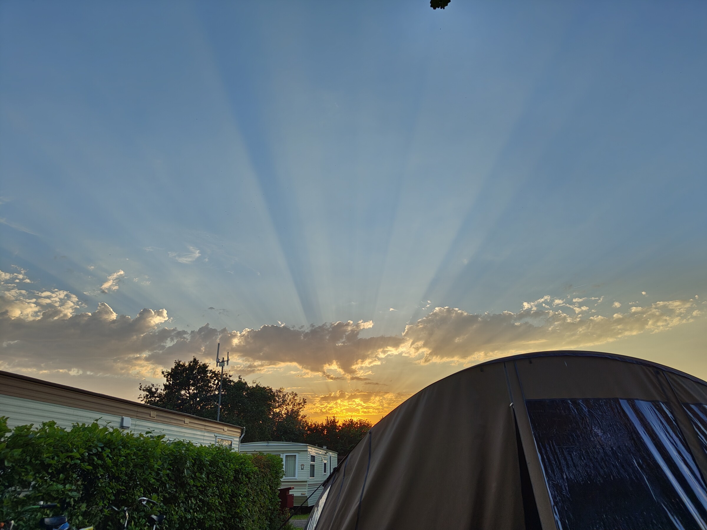 Prachtige zonsondergang zojuist op de camping hier in Ouddorp! Inmiddels zwaar bewolkt met zelfs dikke druppels! Nog altijd zo'n 30°C!