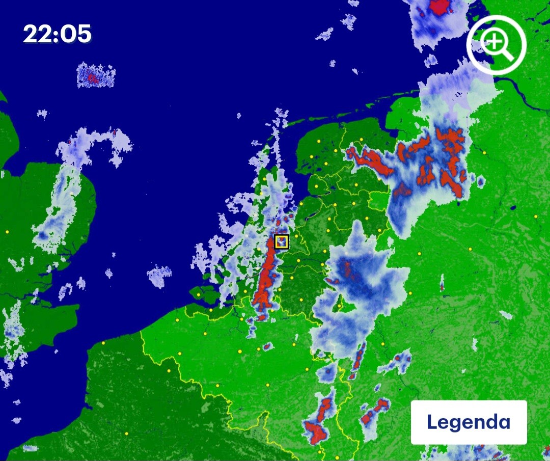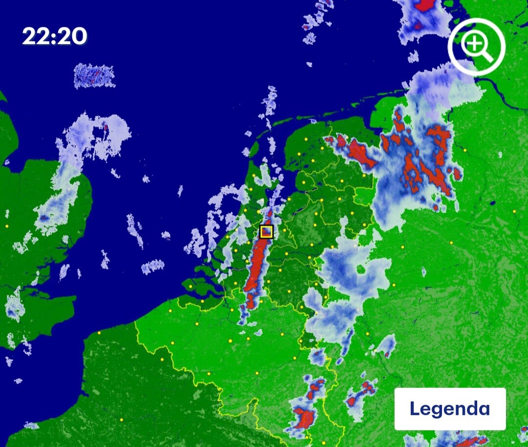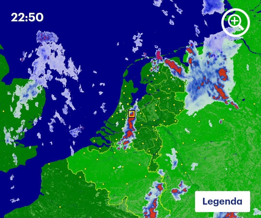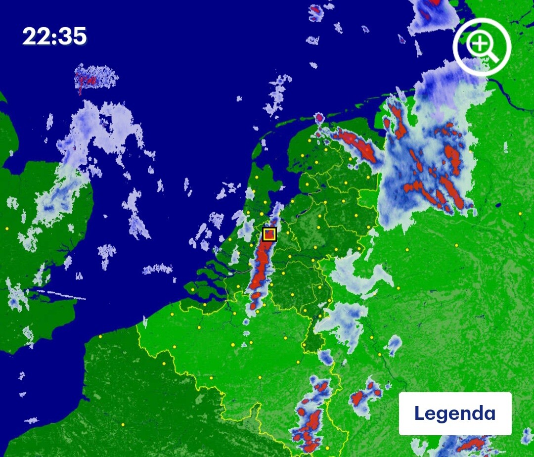 Mijn maatje en ik zaten gisterenavond te borrelen onder een parasol op een terras in het centrum van Utrecht en ik zou om 22:18 de trein terug nemen. Net voordat ik terugliep naar Utrecht Centraal, barstte het los. We zaten onder de parasol en het weer ging zwaar tekeer met hevige regenval en onweer. Uiteindelijk heb ik wel de trein gepakt en stond daar zeker nog van 22:30 tot 23:10 op station Maarssen, toen het weer eindelijk stopte. Helaas heb ik geen foto's of video's kunnen maken, dat was te lastig. Er was behoorlijk wat bliksem, maar op 1 of andere manier is het me niet gelukt om het vast te leggen. Ook de donderslagen klonken als zware explosies, met voortdurende inslagen. En de knallen waren voor mijn gevoel vooral het hoogtepunt bij dit onweer. Zo'n onweer heb ik in lange tijd niet meegemaakt, laat staan om het buiten deels mee te maken! Hieronder kun je zien waar ik stond op het station plus de buienrader met mijn locatie aan. De bui schoof helemaal in de lengte over