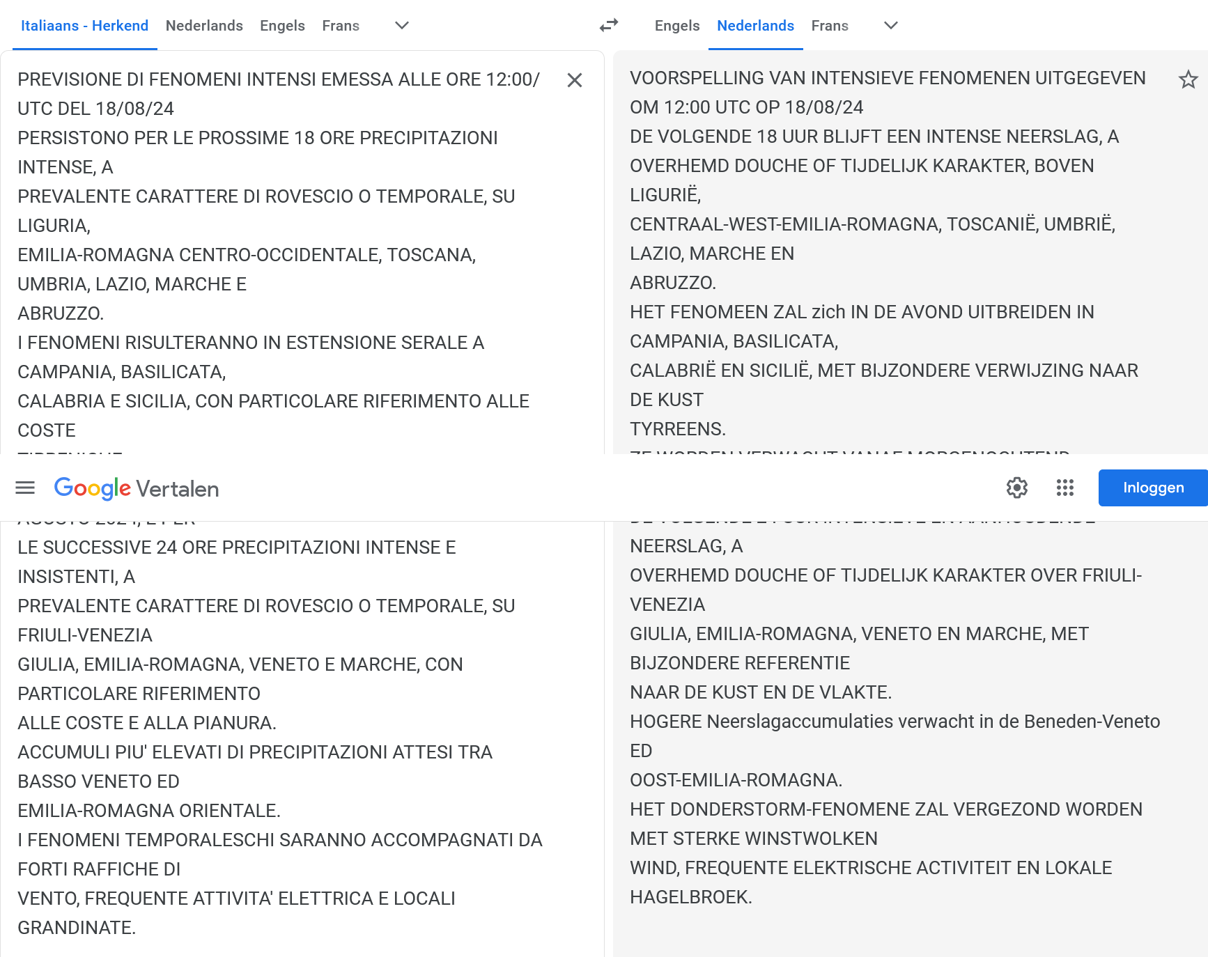voor zover ik het begrepen heb stond er vanaf gisteren 18-08 11.58 een waarschuwing uit voor een groot gebied in het midden van Italië. s Avonds zou Zuid Italië incl. Sicilië ook te maken krijgen met risico op noodweer, met name de kusten. De vertaling is op sommige punten jammergenoeg grappig, helaas bij dit bericht.