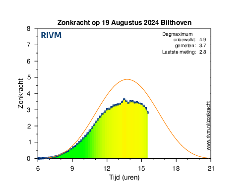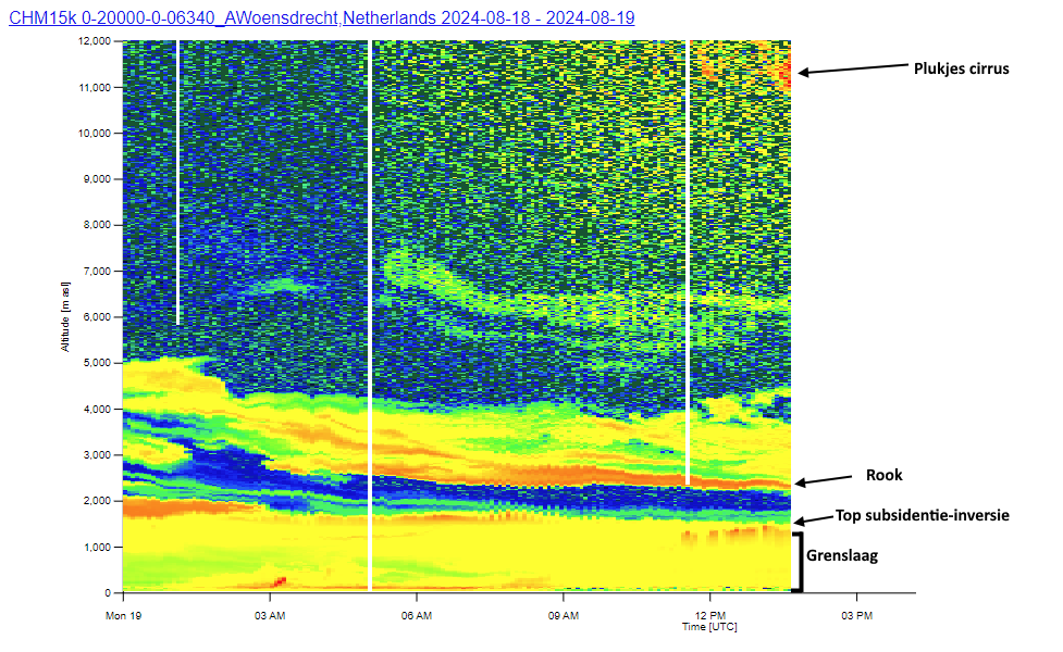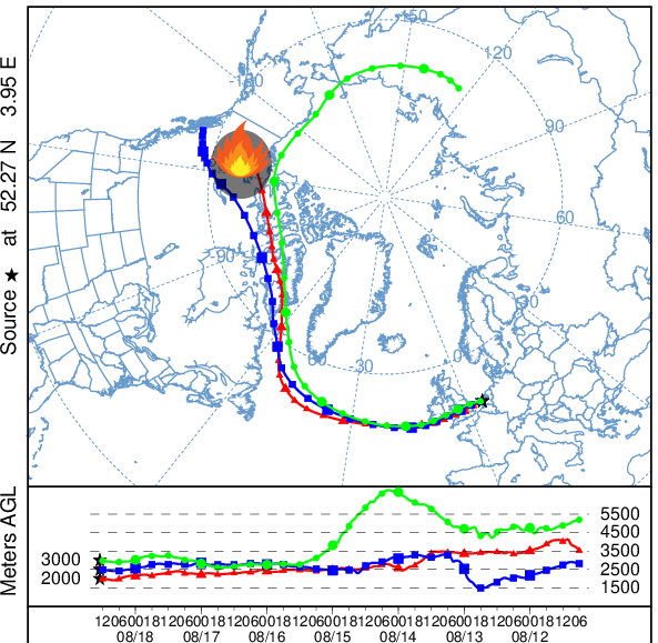 Verstrooiing van zonlicht door de rooklaag rond 2,5 kilometer hoogte zorgt ervoor dat de maximale UV-index vandaag bij lange na niet wordt gehaald. De verwachting was rond de 5, maar daar bleven we met 3,7 ruim onder. De rook is ook nog altijd goed te zien op de wolkenhoogtemeter (LIDAR) van Woensdrecht. De onderkant van de laag op een hoogte van circa 2,5 kilometer, daarboven gaat het nog een ruime kilometer door. Goed te zien (laatste afbeelding) dat deze lucht werd aangevoerd vanuit Canada, waar het 5-6 dagen geleden nog verbleef. De rook heeft in totaal dus een afstand van ruim 8000 kilometer afgelegd, alvorens gisteren en vandaag in Nederland aan te komen.