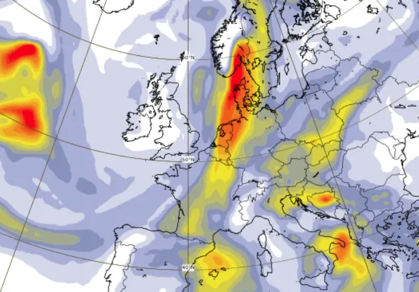 Dit is de situatie om 14:00 uur lokale tijd. De rook wordt duidelijk oostwaarts geblazen, uiteraard door het opstomen van een frontale zone. Voorafgaand aan dit front in het oosten nog geregeld een deels gesluierde zon door de rook. In het westen al snel bewolkt dus dan is het niet meer merkbaar. Harmonie geeft in het uiterste oosten een zomerse dag, denk dat die er wel net gaat komen (uiterste oosten en zuidoosten).