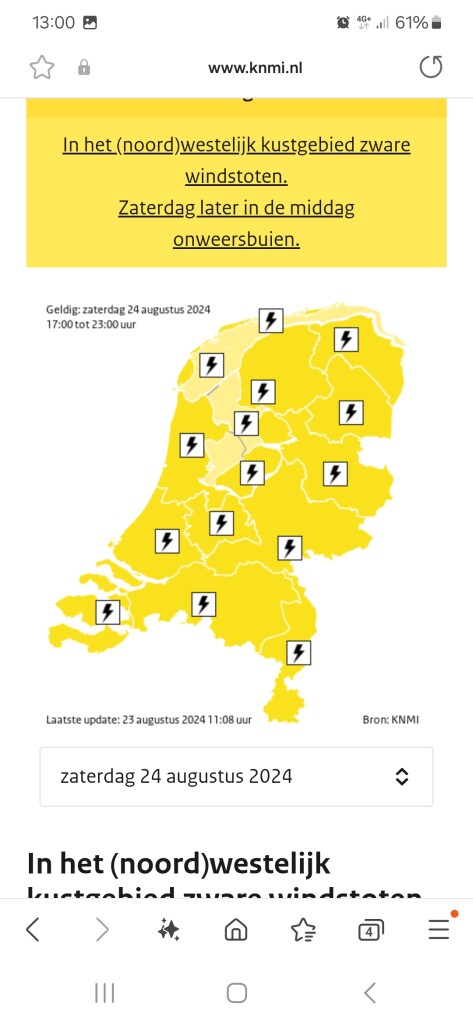 Belangrijkste aandachtspunt voor de komende uren zijn de windsnelheid en de windstoten. Na koufrontpassage vanmiddag weer een afnemende wind. In de EC-uitvoer is zoals vaak de wolkenbasis te hoog bij de fronten, de Harmonie-uitvoer is bruikbaar, al zit de basis lokaal in het noordwesten net wat lager dan het model aangeeft. Aandachtspunt voor zaterdag in de namiddag/-avond is de convectie die aan de oostkant van koufront ontstaat in de convergentiezone ontstaat. Een groot deel van het land lijkt hiermee te maken te krijgen. Mogelijk dat de convectie in het (uiterste) westen nog relatief meevalt. Dat vertaalt zich dan in minder zware buien, mogelijk geen onweer. Toch zien we dat UWC ook daar met zware windstoten komt. Daarom overal code geel voor convectie met kans op stevige windstoten. Knmi guindance