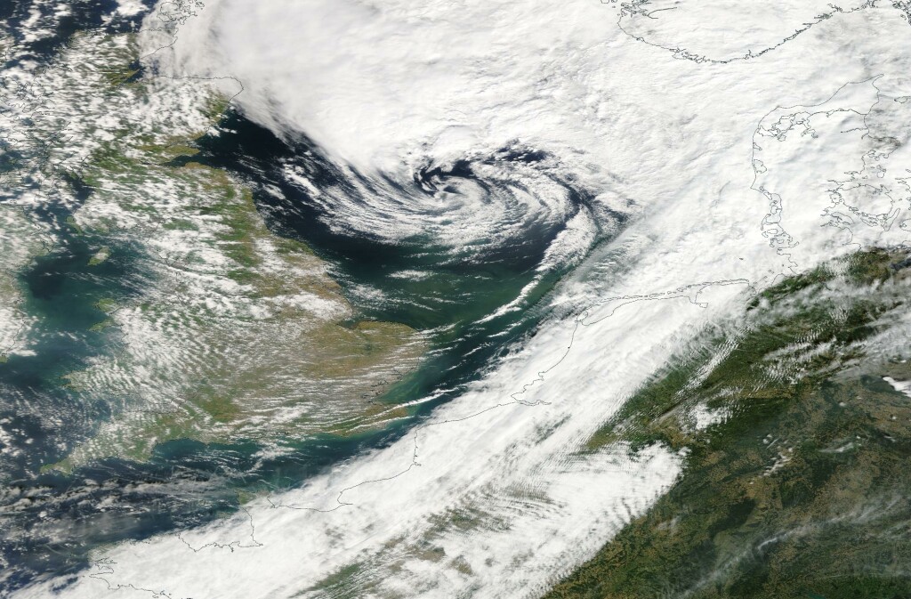 Flinke bui zojuist. Depressiekrul mooi zichtbaar op satellietfoto