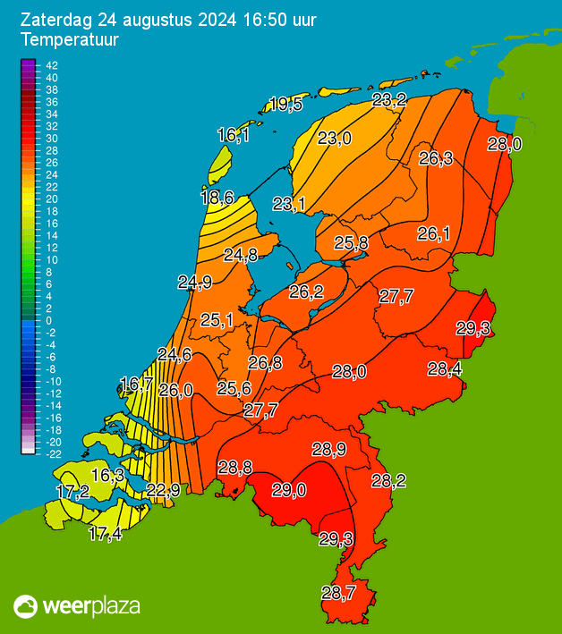 Omgeving Goes 16,3 C, Gilze Rijen 28,8 C en iets verderop in Ell 29,3 C