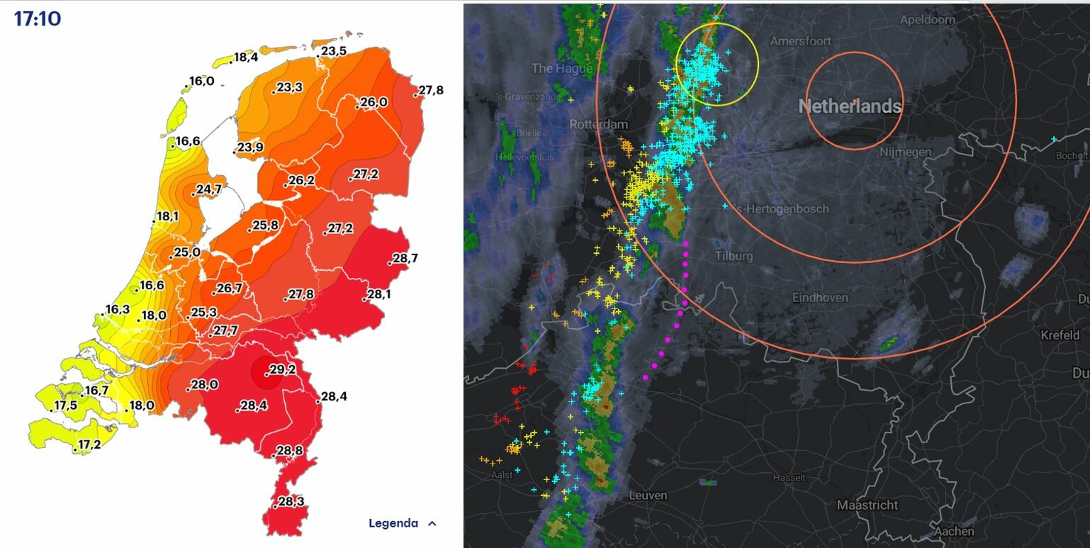 Inderdaad zou je met zulke verschillen in temperatuur alleen al lokaal (zeer) zware windstoten verwachten. Nog los van de dynamische meekoppeling. Op de paarse stippellijn is de outflowboundary te vinden van het meer zuidelijke deel van de squall-line.