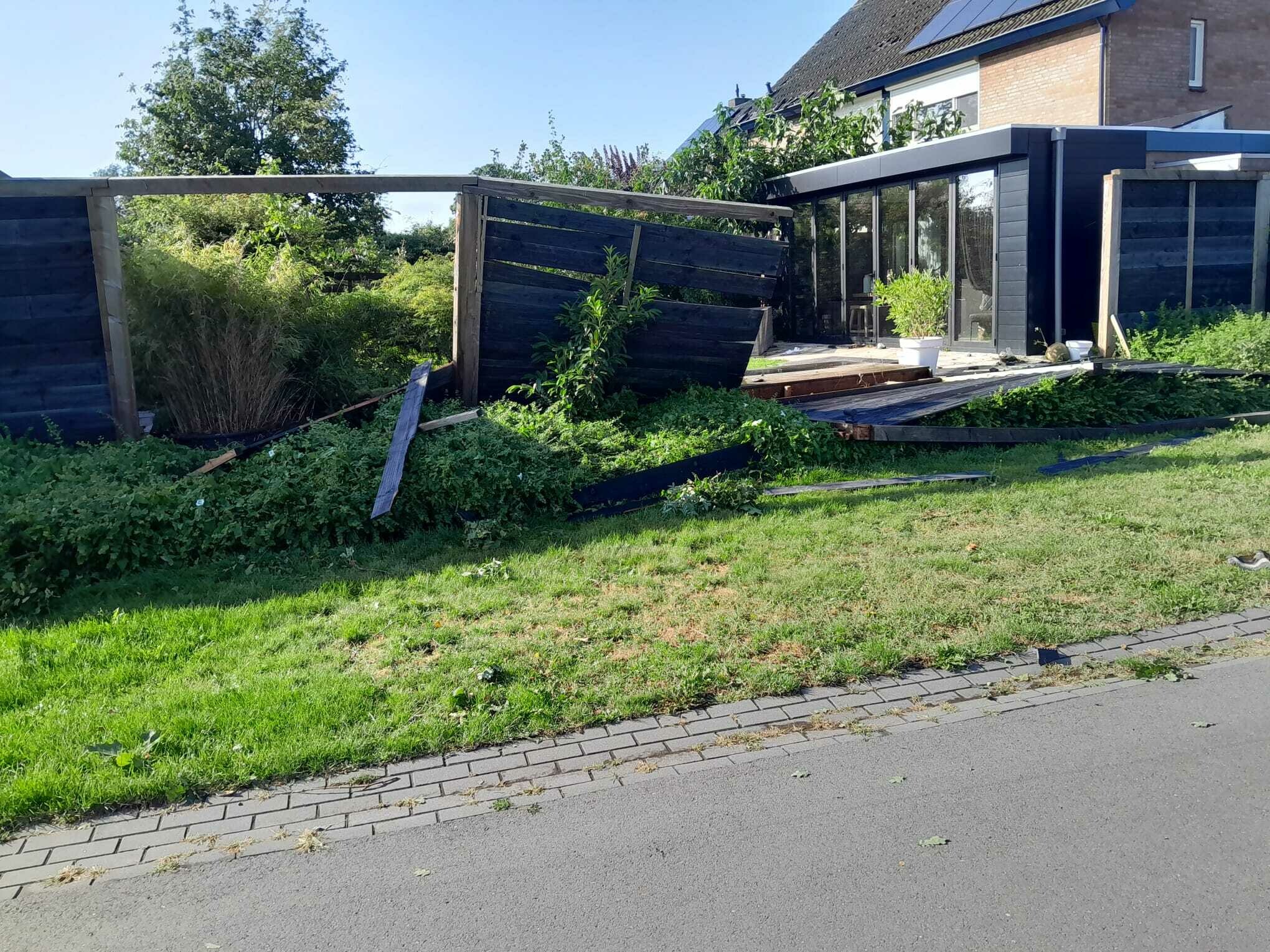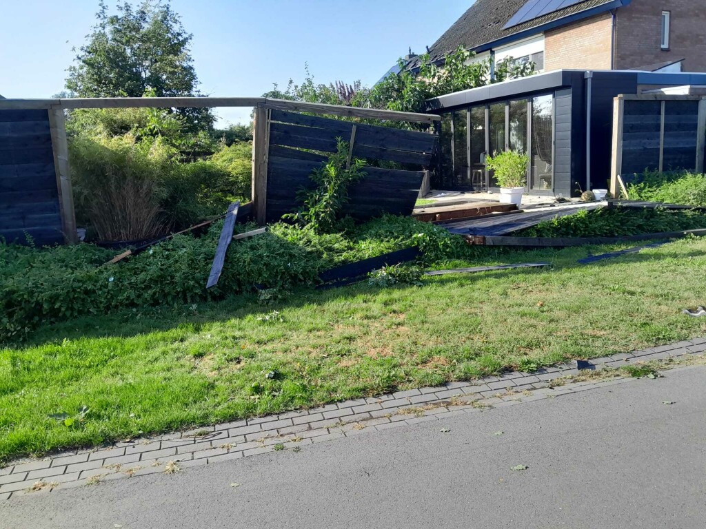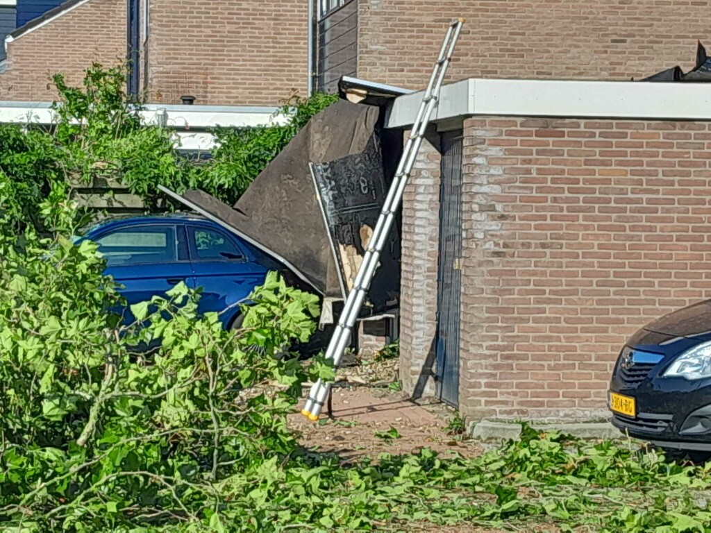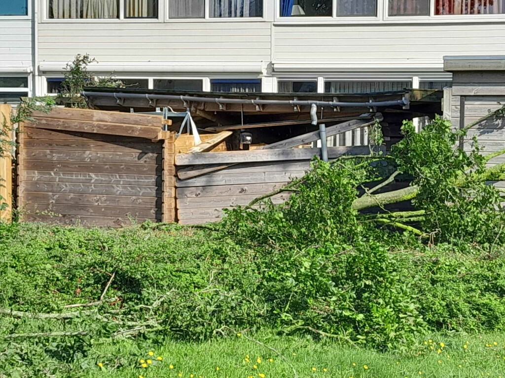 Enorme schade in de buurt na de valwind van gisteren. Vrijwel alle bomen zijn in meer of mindere mate beschadigd, tientallen zijn omgewaaid of geknakt, 2 gevels omgewaaid, veel daken hebben schade, auto's zijn beschadigd door bomen of door rondvliegend puin, paaltjes zijn omgewaaid, sommige ruiten zijn beschadigd en zo kun je nog wel even doorgaan. Vrijwel iedereen heeft het hier over de valwind van gisteren. Overal ligt puin. Het lijkt wel Leersum 2021.