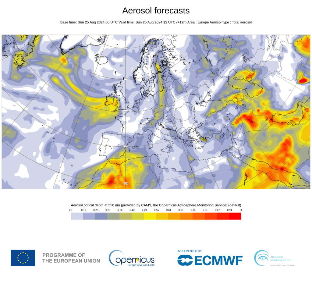 Aangezien Victor dit hieronder in het draadje vermoedde, ben ik even bij Copercnicus gaan kijken. Er lijkt inderdaad een vrij zwak signaal voor aërosolen aanwezig boven de Benelux. Morgen en dinsdag komt er weer een flinke pluim over, die hangt nu nog bij de Britse Eilanden. Ook aanstaande woensdagavond en donderdag lopen de concentraties wederom op naar vrij hoge waarden.
