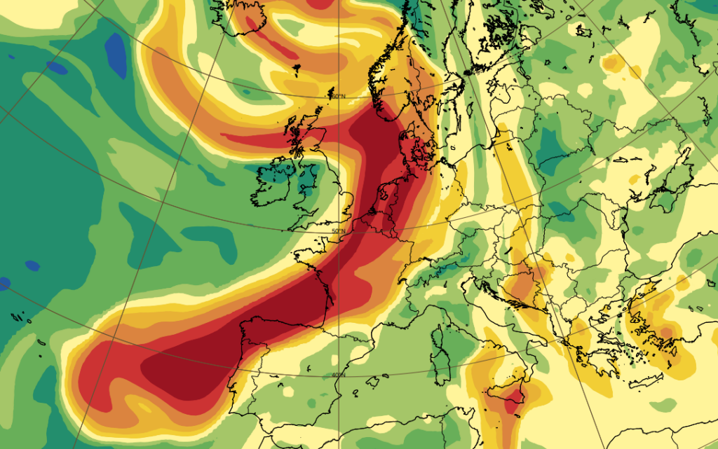 Het zou SO2 zijn van de recente uitbarsting op IJsland. Copernicus neemt die zo te zien niet mee? Ik vind er nu net een artikel over in het Frans. En ook een Luxemburgs artikel in het Duits. Adbeelding is uit het franstalige artikel.