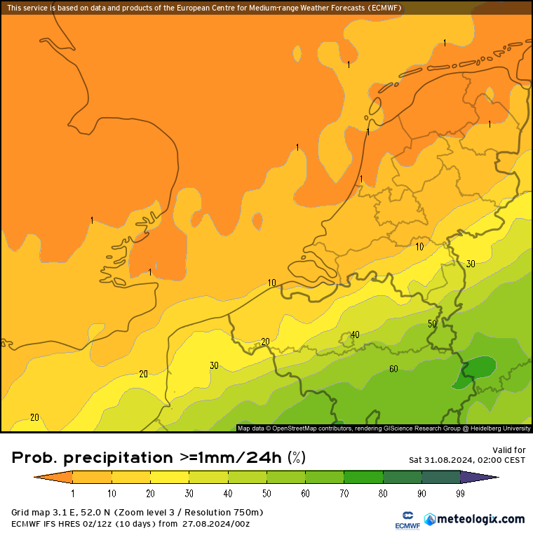 Kans op >1 mm ligt tussen 1% in het NW en 70% in ZO v/d Benelux
