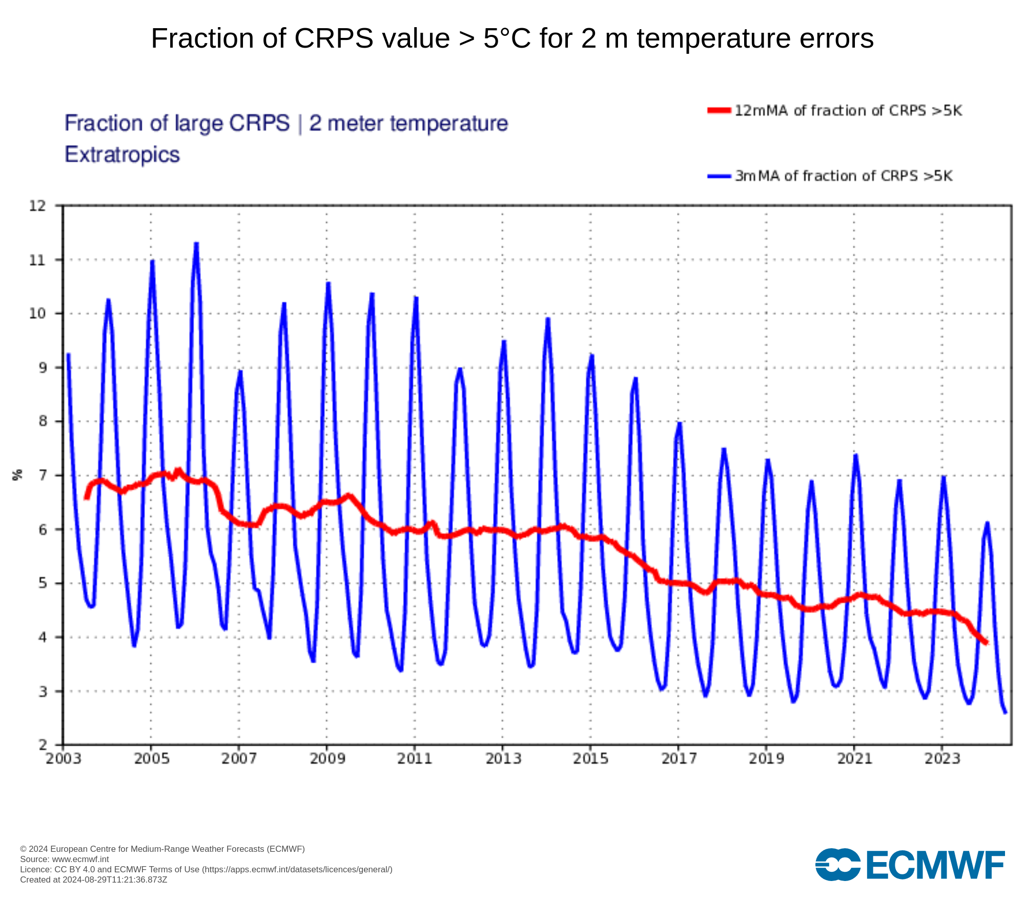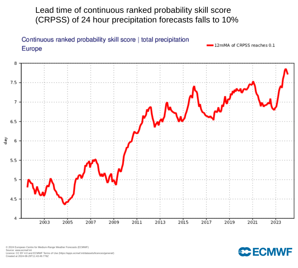 Hier de lead time waarbij de CRPSS voor neerslag onder de 10% duikt (hoe langer, hoe beter) en het percentage van grote errors voor de 2-meter temperatuur (hoe lager, hoe beter). Beide laten een vergelijkbare trend zien.