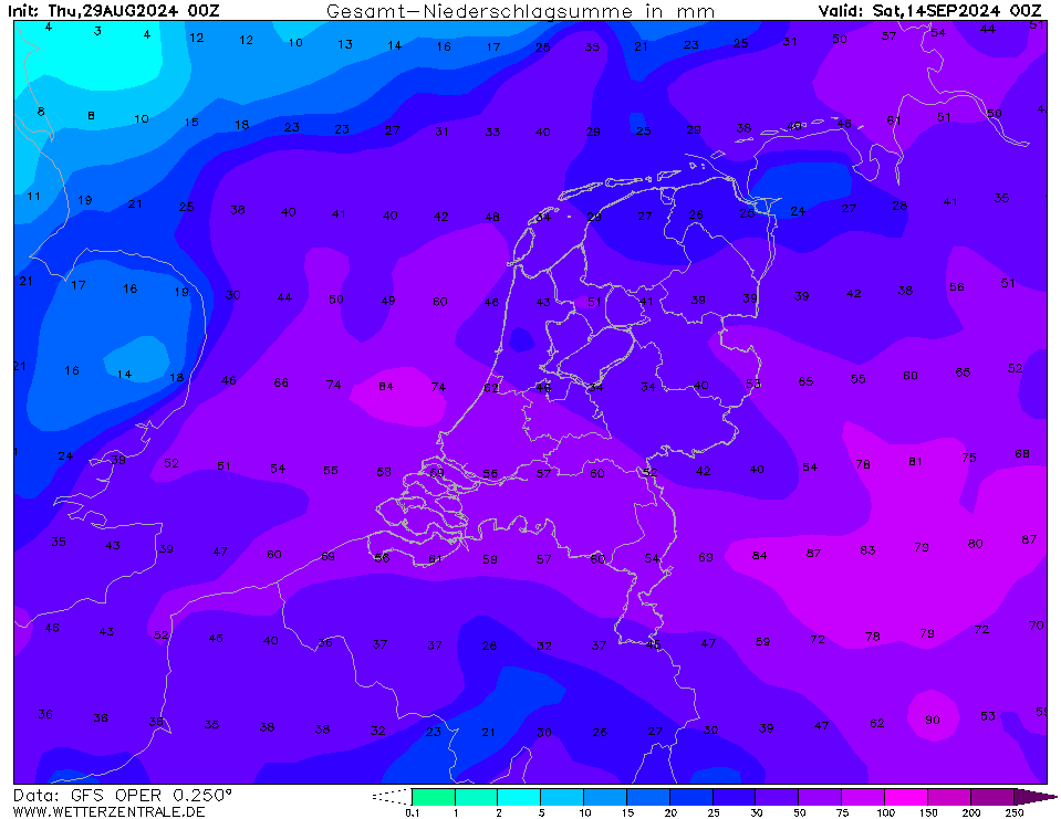 Twee beelden van 0 uur neerslag 11 dagen en langer laten nu opvallend verschil zien. Opers van 0 uur 29 augustus en vandaag 0 uur 30 augustus.