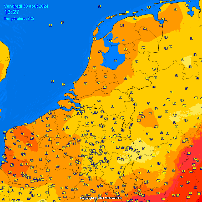 Kaartje Meteociel laat de 20 graden-isotherm over de Benelux zien.