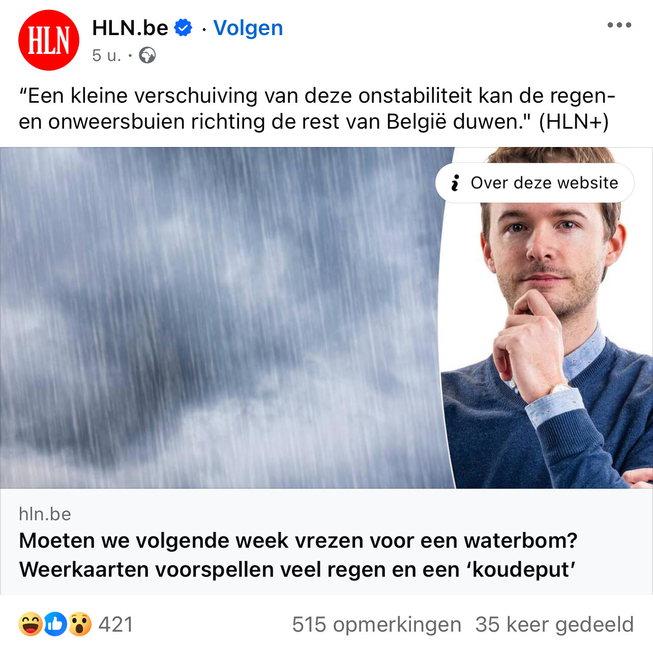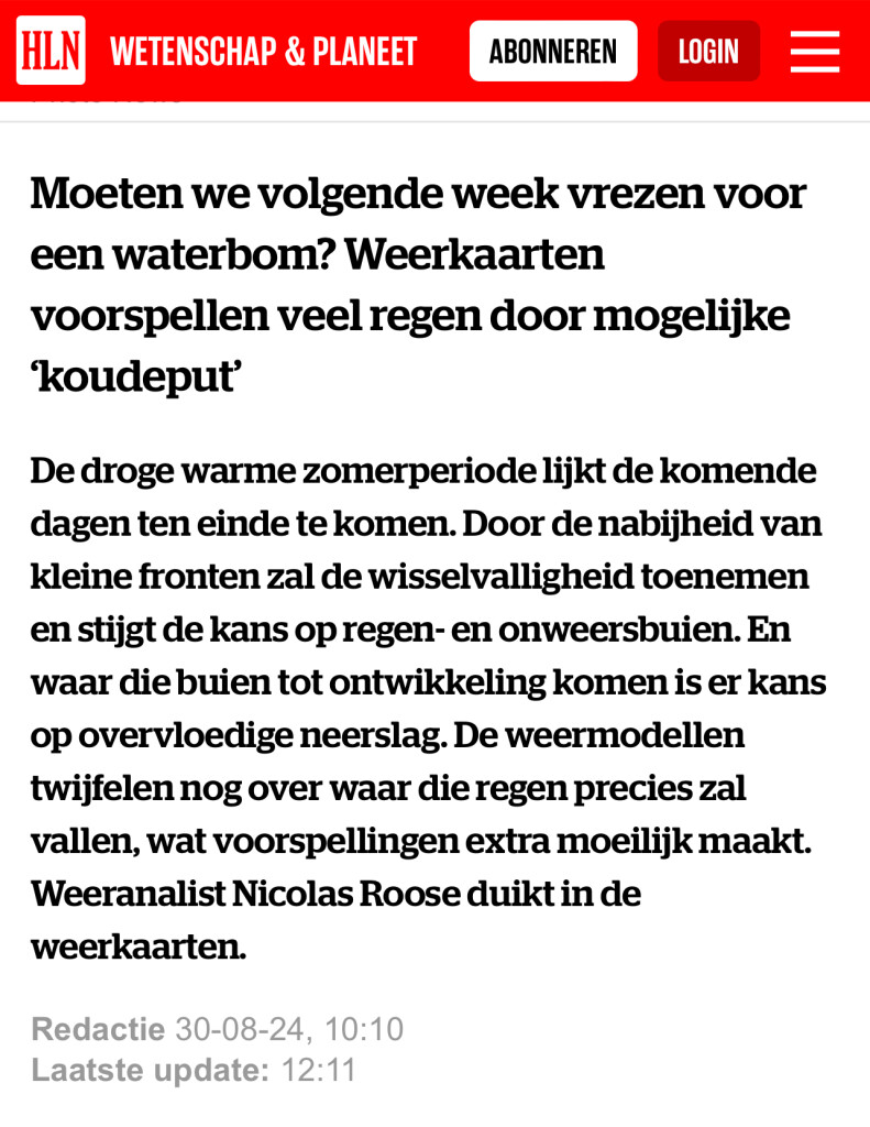 Ik vind dit soort sensatie-berichten over zogenaamde “waterbommen” op zich al jammer, maar het wordt nog triester als die zogenaamde weeranalist ook nog eens uit onze eigen WW- rangen komt. Beseffen we eigenlijk wel wat een impact je hebt als je je door een heel bekende krant laat bombarderen tot een autoriteit op het vlak van weerkunde, en je vervolgens zulke uitspraken doet die gebaseerd zijn op nattevingerwerk/sensatie? We hopen mensen mee te krijgen in het verhaal van klimaatverandering, maar op deze manier met alle desinformatie en sensatie worden we alleen maar ongeloofwaardiger.