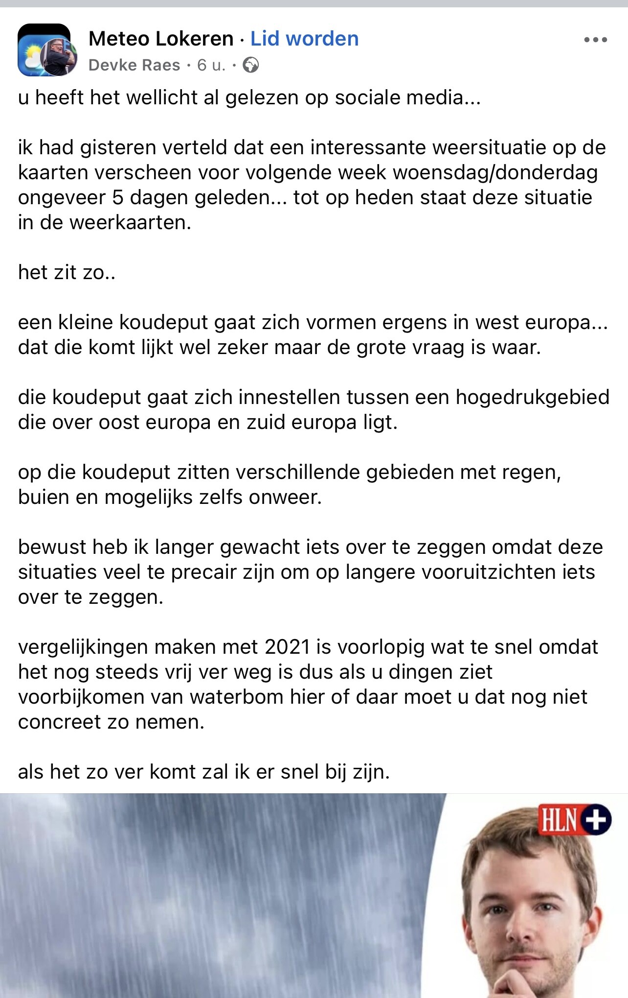 Waarom het niet gewoon eerlijk zeggen zoals het is? Er is kans dat er volgende week een koudeput in onze contreien gaat rondtollen. Het kan wisselvallig worden of droger blijven, maar veel kunnen we daar nog niet over kwijt. Te onzeker, en basta! Indien er zulke onzekerheid is, zou ik me sowieso al niet speciaal laten interviewen hierover. Dan was het telefonisch heel eenvoudig: “sorry, te vroeg om er uitspraken over te doen, en ik wil mensen niet onnodig angst aanjagen.” Voor voorspellingen zijn er namelijk de reguliere weermannen die op tv deze uitleg met de nodige nuance kunnen doen.