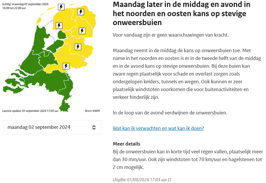 Het heeft wel iets dat de symbolen, zoals die worden weergegeven in de zesdaagse verwachting op het startscherm van weerwoord, automatisch zwart worden als er een waarschuwing van het KNMI van kracht is. Die is dus een uurtje geleden uitgegaan, en gaat over het te verwachten onweer morgenmiddag en -avond, van 16 tot 22 uur. Is dat eindtijdstip trouwens niet te vroeg gekozen? En Limburg heeft geen waarschuwing, of ook Noord Brabant; Utrecht en Flevoland? Er zijn zelfs berekeningen die in het westen het een en ander geven.