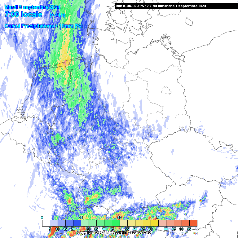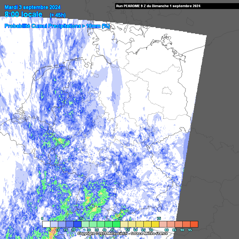 22 uur als eindtijd lijkt me inderdaad wat vroeg, maar goed, genoeg tijd om dat nog aan te passen. Dit zijn trouwens de kansen op cumulatief >10 mm neerslag volgens het ICON- en AROME ensemble. Nadruk ligt vooral op het oosten en noordoosten.