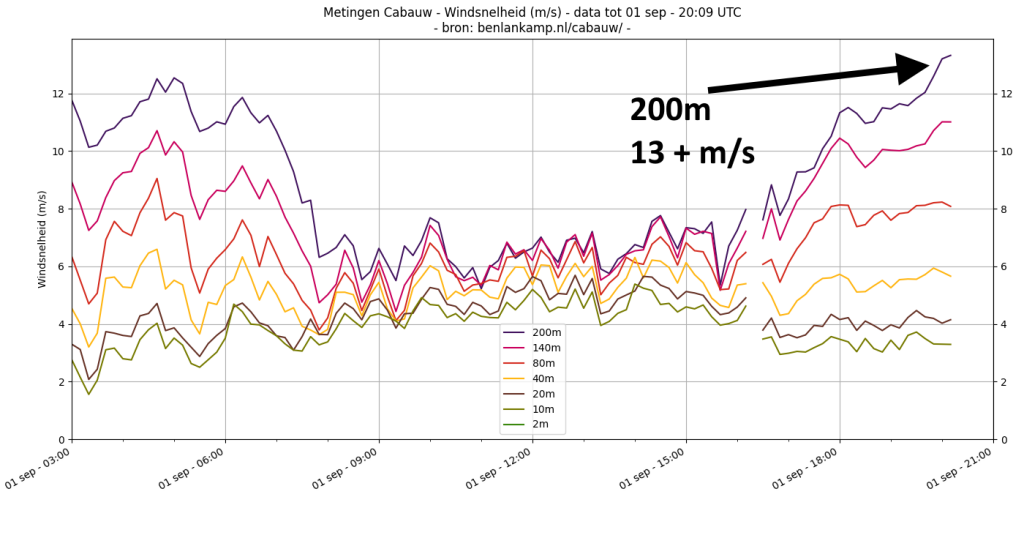 Gemiddelde windsnelheid iets meer dan 13m/s, wat neerkomt op een hele hoge 6BFT, tippend aan de 7BFT. Bovenop de Rotterdamse Zalmhaventoren (215 meter) waai je nu uit je sokken, terwijl het onder op 't Willemsplein met 3-4m/s meevalt. Typisch geval van een nachtelijk windmaximum, terwijl de grondinversie nu relatief niet eens zo heel prominent is. Ook aan de grond waait het nog voldoende door om voor menging met warmere luchtlagen hogerop te blijven zorgen. Hierdoor is het lokaal nog zomers warm. ![]()