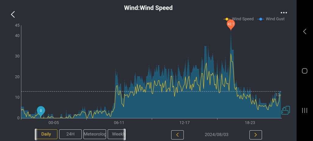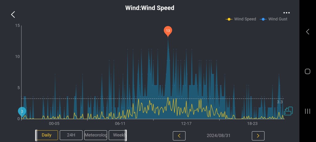 Bovenste is van 31 augustus, en de onderste van 3 augustus. 31 augustus was een vrij winderige dag, 3 augustus echter niet. Toch is het verschil enorm te noemen. Zie bijvoorbeeld hoe de windkracht afwijkt van de windstoten in beide grafieken, die van 3 augustus wijkt veel minder af en is ook constanter over de gehele linie.