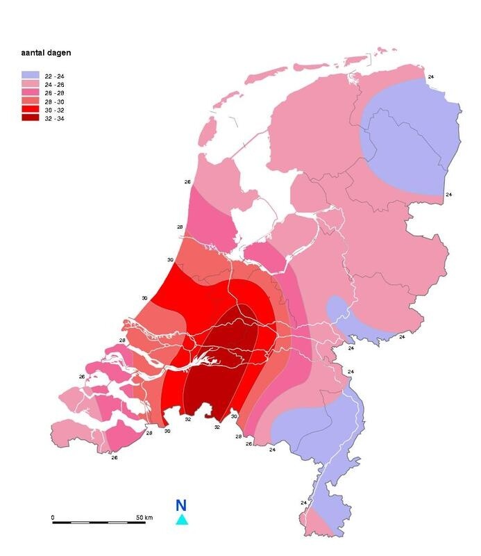 Vreemd, ik meende mij te herinneren dat er voorheen ook kaartjes met betrekking tot het aantal onweersdagen in de klimatologie aanwezig waren. Blijkbaar niet? Onderstaande ook maar ergens van het web geplukt.