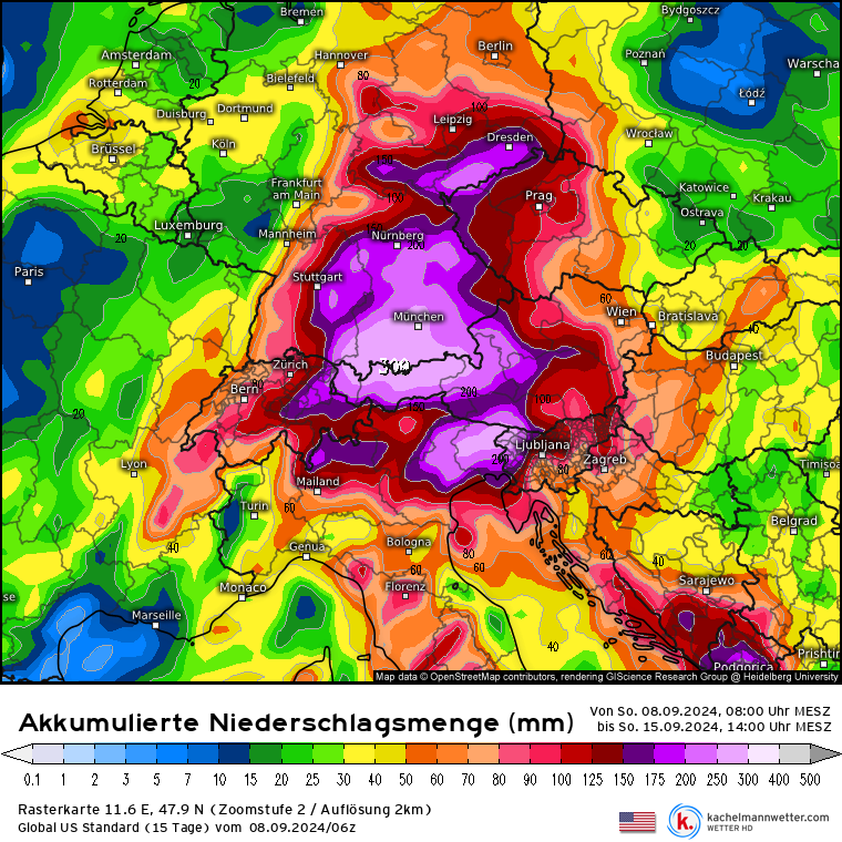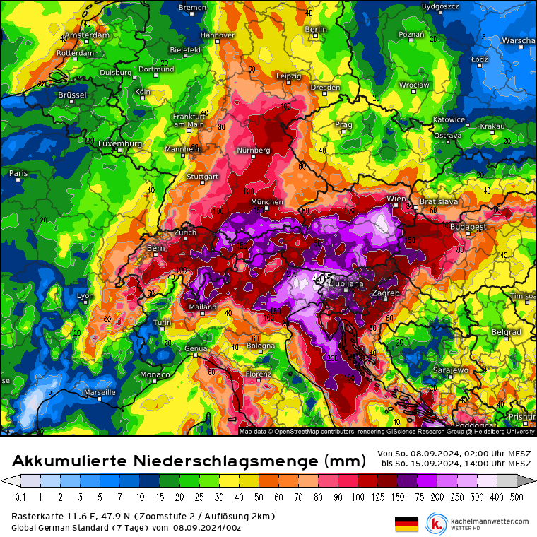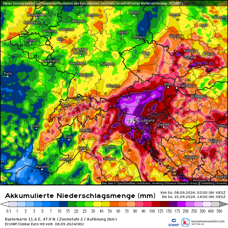Voor Zuid Duitsland zijn de drie modellen het niet echt eens, maar wel dat het mogelijk nog erger kan worden in delen van Oostenrijk, noordoost Italie en Slovenie. Dit zijn de berekende neerslagtotalen tot maandagmiddag 15 september van ICON 00Z, GFS 06Z en EC 00Z. Dat wordt dus vrijwel zeker op een aantal plaatsen te veel.